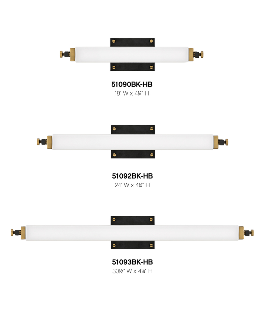 Rollins is both industrial in form and transitional in style. Unique rectangular etched opal glass has softly rounded edges offset by contrasting details on the backplate and the square knobs anchoring either end. This integrated LED design comes in two finish combinations, Black with Chrome and Black with Heritage Brass, and can be hung both vertically and horizontally.