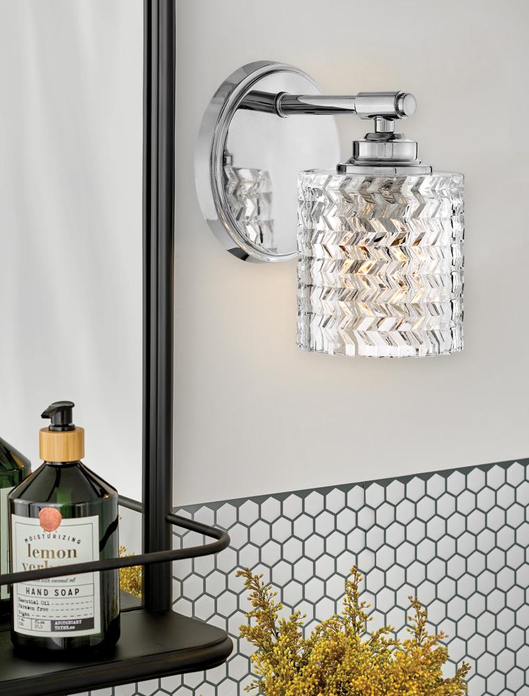 Traditional elegance with a modern edge defines Elle’s graceful design. Rich chevron cut glass provides interesting light refraction and is a dramatic focal point whether the light is on or off. The gleaming metal finish adds to the glam design that gives a touch of radiance to any space.