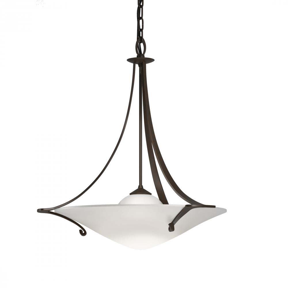 The Antasia Pendant, featuring sinuous curves of iron cradling a glass bowl and the bowl itself, that looks like a dome of water ready to stretch into a drop, was inspired by the art Nouveau movement. Created by artisans at our forge here in Vermont.
