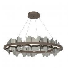 This magnificent and dramatic Hildene Circular pendant, with its crafted hills and valleys creating shadow and light, is a focal piece in any space. Part of the Hildene Collection, this large pendant's curved metal plates are awash in up-and-down light emanating from the LED lightguide encased in its circular frame. The Hildene is offered with a two-toned finish option, with the canopy and frame in one finish, and the metal plates in a choice of accent colors. Also available as a linear cable-hung pendant, a large linear rod-hung pendant, and a wall sconce.