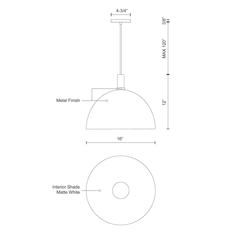 Single-lamp pendant with aluminum dome shade showcasing powder-coated or plated finishes with metal details and a matte white interior. Exterior shade colors are black, brushed nickel, or white. Suspended by cloth cable. Available in three sizes.