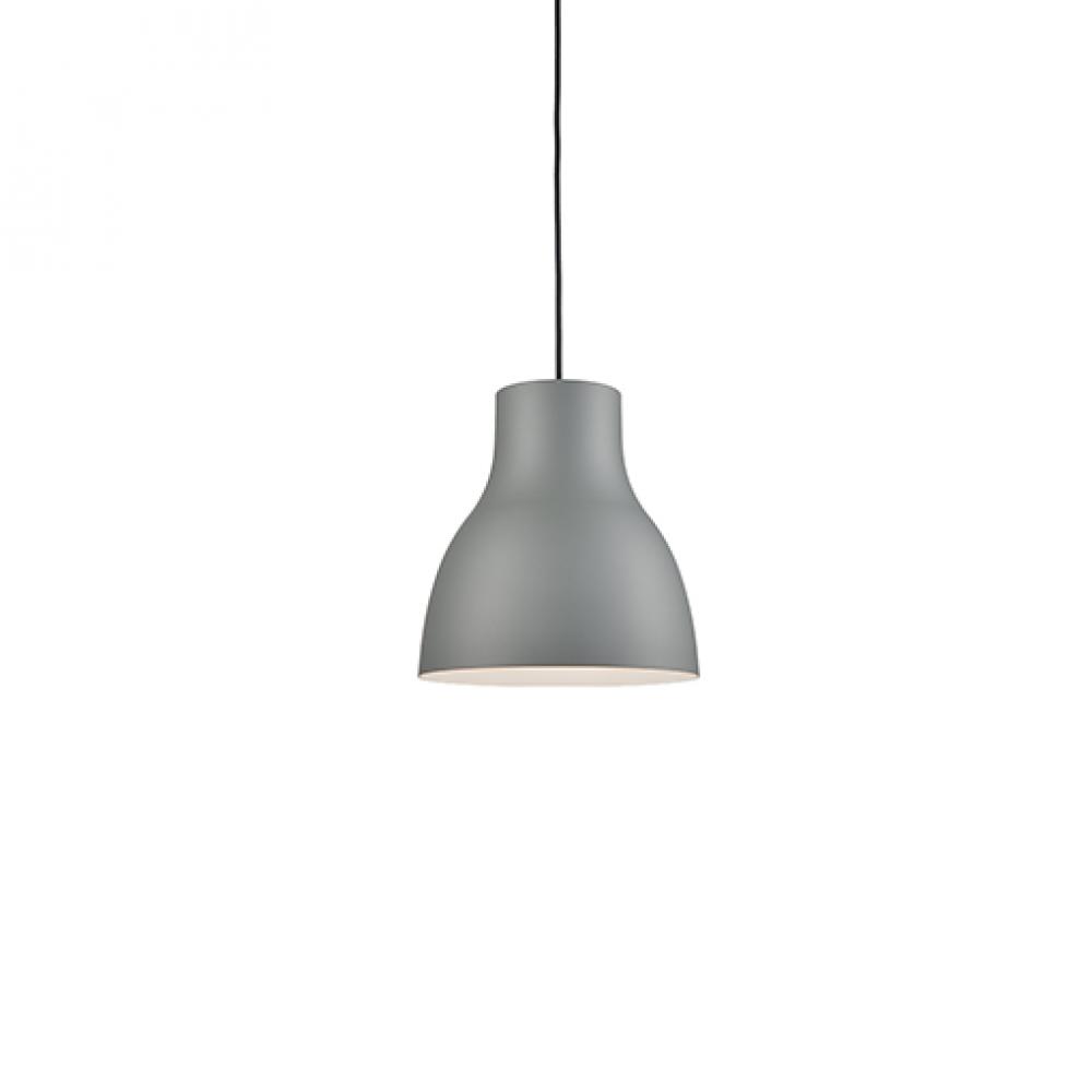 Single-lamp pendant with tapered aluminum shade showcasing powder-coated finishes. Exterior shade colors are either black, gray or white, with matte white interior. Suspended by cloth cable . Available in three sizes.