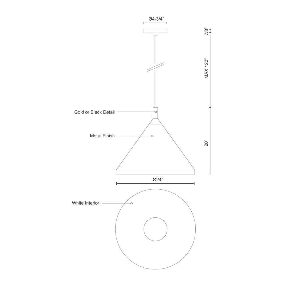 Single lamp pendant with conical aluminum shade with fine powder-coated or plated finishes with contrasting finial. Exterior shade colors are black or white with gold detail or brushed nickel with black detail. Suspended by cloth cable. Available in 2 sizes.
