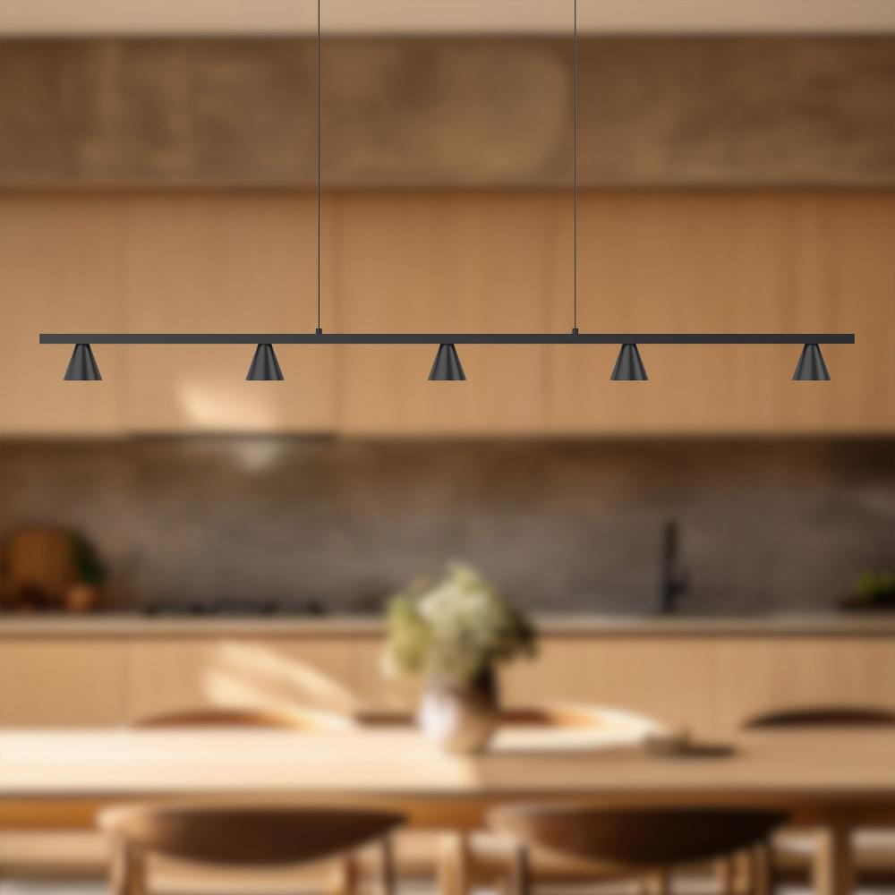 Multiple aluminum cones are connected inline and direct light downwards from the geometric linear pendant. The Dune series utilizes classic minimalist lamp shapes yet in reduced scale to elegant effect. The LED spot sources are focused by diminutive reflectors housed within the exquisitely turned shades. Available in multiple configurations and finishes.