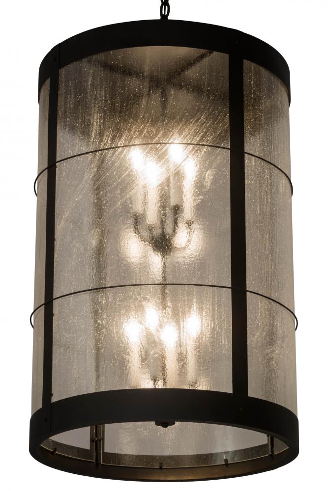 Custom crafted of Solid Brass; Villa features a stunning transitional lighting design. The unique cylindrical shaped pendant is designed with Clear Seeded glass which is complemented with a Brass frame and hardware featured in an Old Wrought Iron finish. This ceiling fixture is handmade by skilled artisans in the USA and reveals two faux four-light candelabras that illuminate from within. Custom sizes; styles; colors and dimmable lamping options are available. This pendant is UL and cUL listed for wet; damp; and dry locations.