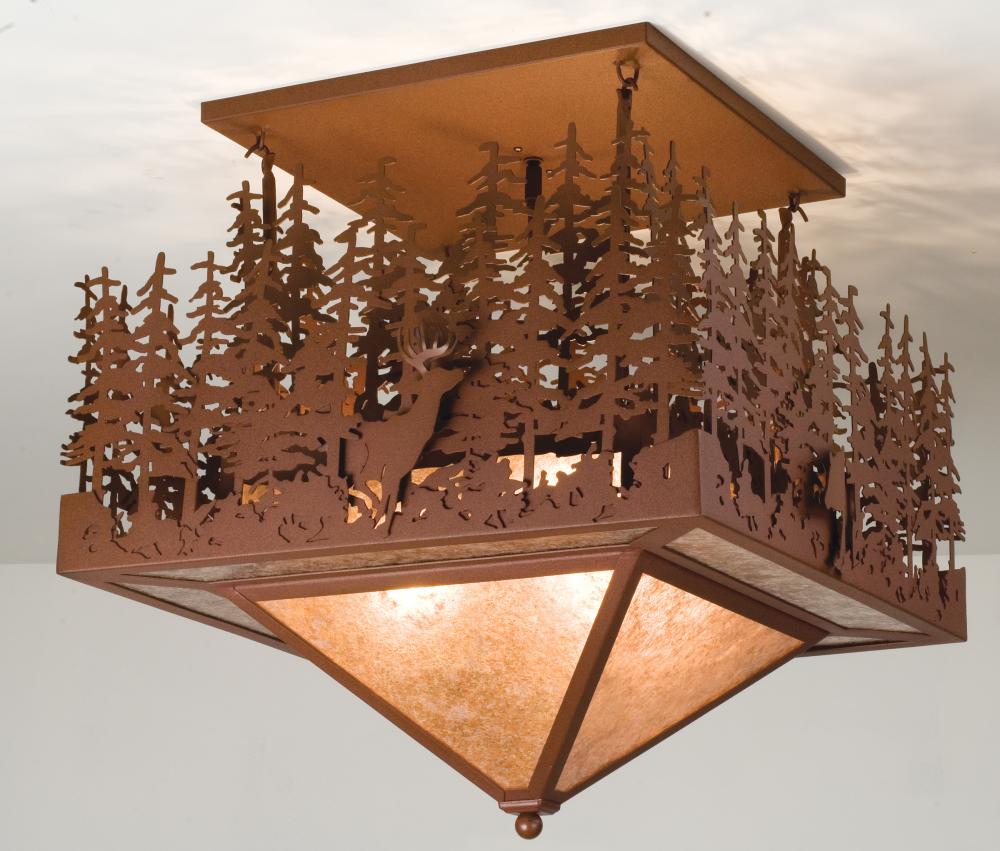 The call of the wild comes to light with a Deer and Grizzly Bear roaming among a vast stand of Pine Trees around a woodland lake as the brilliant afternoon sun sets in the background. Beautiful ambient light shines through Silver Mica which is enhanced with a frame; hardware and decorative accents featured in a Rust finish. The fixture is custom crafted by Meyda expert artisans in its manufacturing facility; at the foothills of New York?s glorious Adirondack Mountains. This ceiling fixture is available in custom designs; styles; sizes and dimmable energy efficient lamping options.