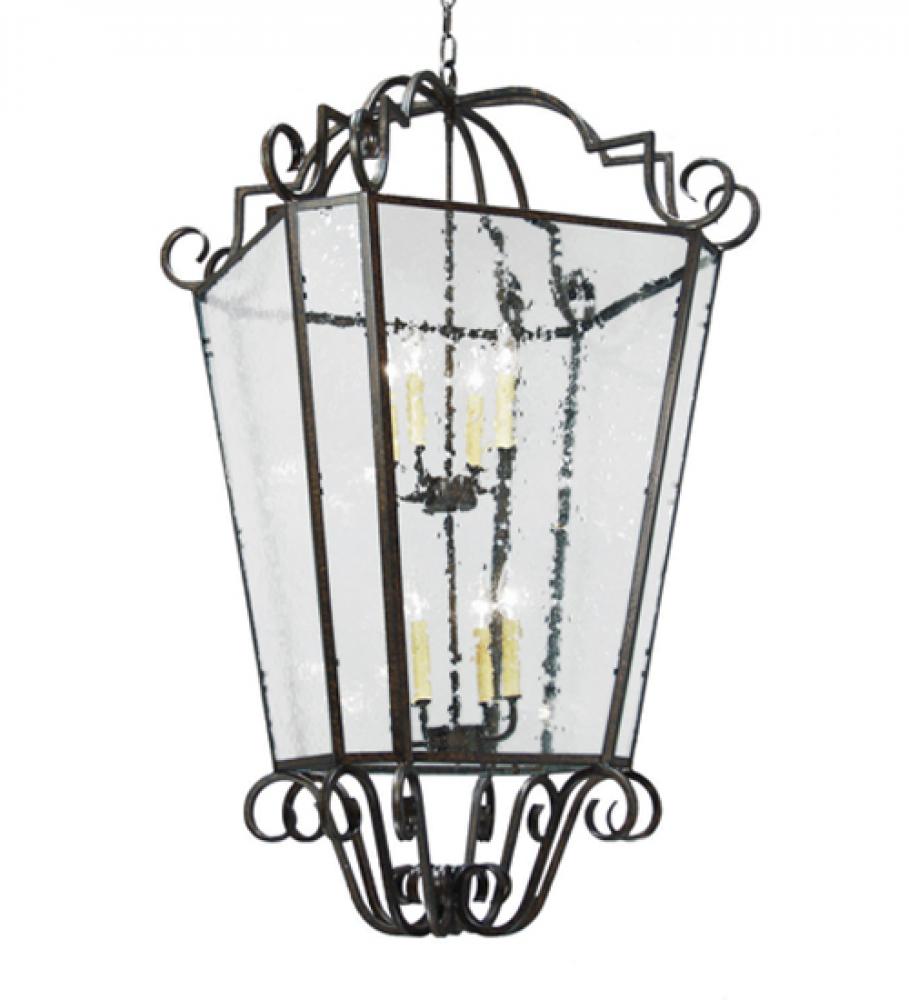 An exquisite pendant for a variety of home; hospitality and commercial settings; the Clear Seeded Glass lens reveals two Ivory 4-light faux candelabras for brilliant ambient illumination. Antique Iron Gate finished scrollwork with matching frame and hardware provide a graceful elegant look and attention to detail. The decorative fixture; which is perfect to welcome guests as a foyer or entryway luminaire or a centerpiece in any room; is custom crafted by artisans using time-honored craftsmanship in Upstate New York in the USA. Dimmable energy efficient lamping options such as LED; as well as custom sizes; styles and colors; are available. The 28-inch lantern is UL and cUL listed for damp and dry locations.