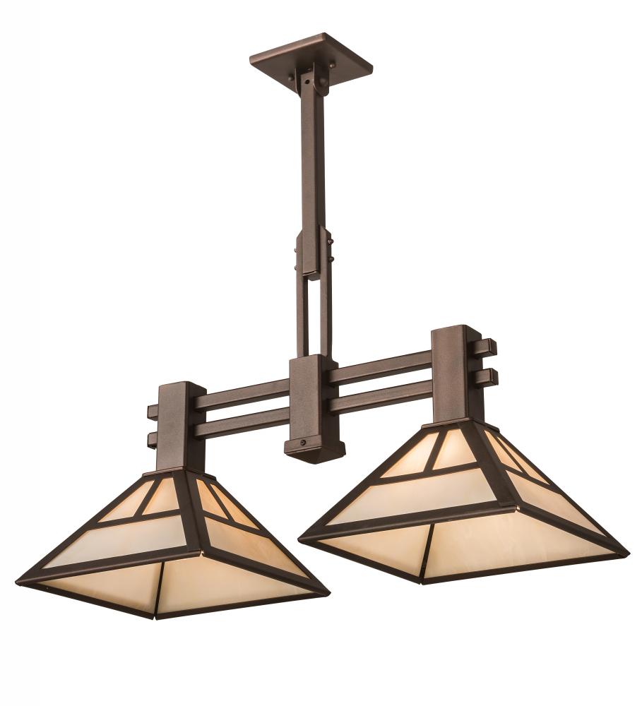 A handsome Mission T pattern adorns this striking Craftsman Signature Ceiling pendant. Handmade with 2 Creme Carrare Idalight shades that are complemented with frame; accents; and hardware in a Mahogany Bronze finish. Ideal for illuminating islands; counters; and tables in residential; retail and hospitality settings. Handcrafted by highly skilled artisans in our 180;000 square foot manufacturing facility in the USA. Dimmable energy efficient lamping options are available. Custom colors; styles and sizes are offered. The 29-inch long pendant is UL and cUL Listed for dry and damp locations.