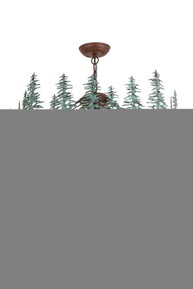 A mesmerizing stand of Handpainted Green Tall Pine trees overlooks an array of five decorative art glass shades featuring interlocking Mission styled patterns in earth toned Bone Beige and Moccasin Tan hues; accented with glistening Root Brown and Sage Green. The shades are created using Meyda Tiffany's famous copperfoil construction method. The circular frame and hardware are offered in a Rust finish. Custom crafted by highly skilled artisans; the fixture is created in our manufacturing facility at the foothills of the spectacular Adirondack Mountains in the USA. Custom designs; styles and colors; as well as dimmable energy efficient lamping options such as LED; are available. The chandelier is UL and cUL listed for damp and dry locations.