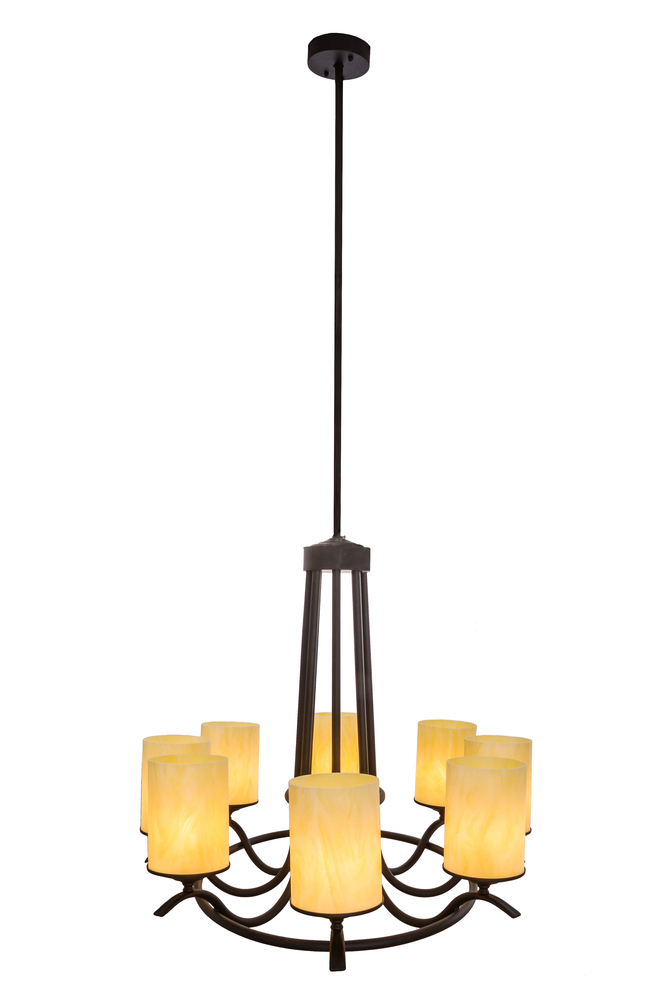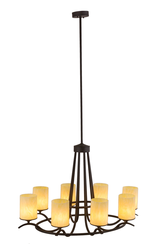 Add graceful details to any interior decor with this elegant lighting design that provides soft ambient illumination. 8 Sahara Taupe Idalight Cylindres are perched on decorative bobeches that are embraced by an elegant frame with curved arms in a richly hued Oil Rubbed Bronze finish. Handcrafted in our manufacturing facility in the USA; this Hand-forged Iron chandelier is available in custom colors; styles; size and dimmable energy efficient lamping options to individualize the look that you need. The 48-inch wide fixture is UL and cUL listed for dry and damp locations.