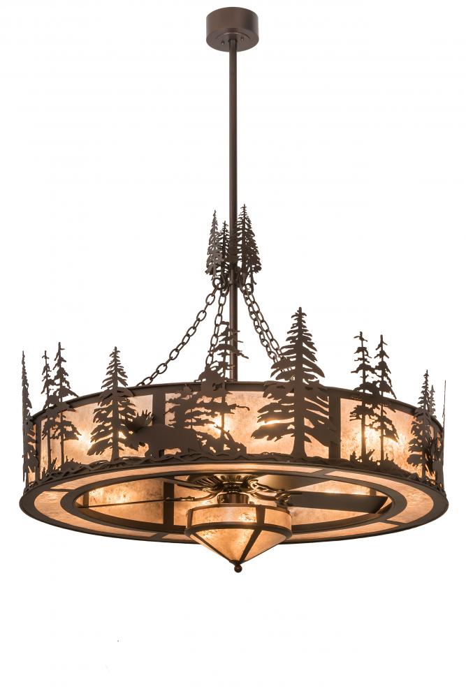 Innovation never looked so good as this custom lighting fixture integrates efficient ceiling fan technology. The Majestic Moose meanders among Tall Pine tree silhouettes that accent this stunning Silver Mica diffuser and is complemented with a smaller matching shade while gentle breezes are created by the fan spinning quietly in the center. This custom crafted Chandel-Air features hardware and accents depicted in a warm Mahogany Bronze finish. This modern marvel includes 16 customer supplied inner lights to bring out the beauty of the larger diffuser while three lamps illuminate the smaller shade. Handcrafted in Yorkville; New York by Meyda artisans; this energy saving Arts & Crafts inspired Chandel-Air" keeps your space cool in the summer. Dimmable energy efficient lamping options are available; as well as custom styles; sizes and colors."