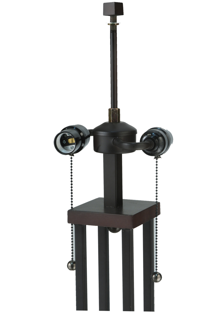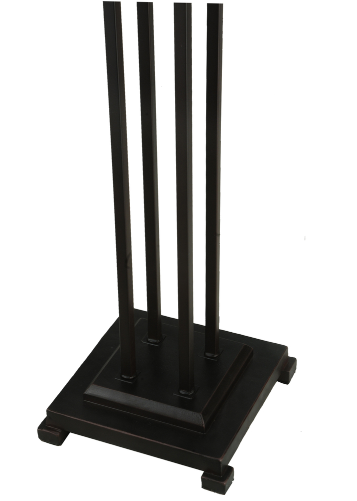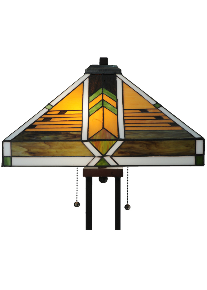 Offering a unique and handsome Mission design; Abilene uses colorful arrowheads of Honey; Woodsy Green and Bark Brown on a multi-designed motif of linear locks of Green; Bark Brown and Amber. The handcrafted stained glass shades; which feature a Mission design that interprets organic objects into geometric forms; are framed in White with Woodsy Green glass and was created using Meyda Tiffany's famous copperfoil construction process. The shade is complemented with Mahogany Bronze finished four-column base.