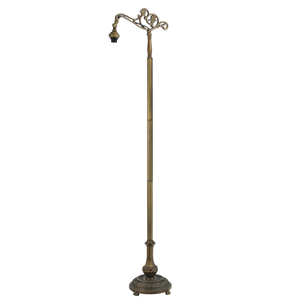 This version of Tiffany Studio's most beloved stained glass dragonfly design is modeled after the original hanging head dragonfly. Diving dragonflies with glowing Scarlet jeweled eyes and delicate metal filigree wings circle over hand cut and copper foiled pieces of Purple and Dusky Sky Blue-Violet art glass and accented with glistening jewels of Scarlet Red and Amber representing an early evening sky reflecting on rippling water. The stained glass shade is handcrafted using Louis Comfort Tiffany's world famous copperfoil construction process. The floor lamp bridge arm and base are finished in a warm hand applied Antique Brass. Ideal for ambient; accent and decorative lighting in fine homes; restaurants; hotels and retail and commercial use.