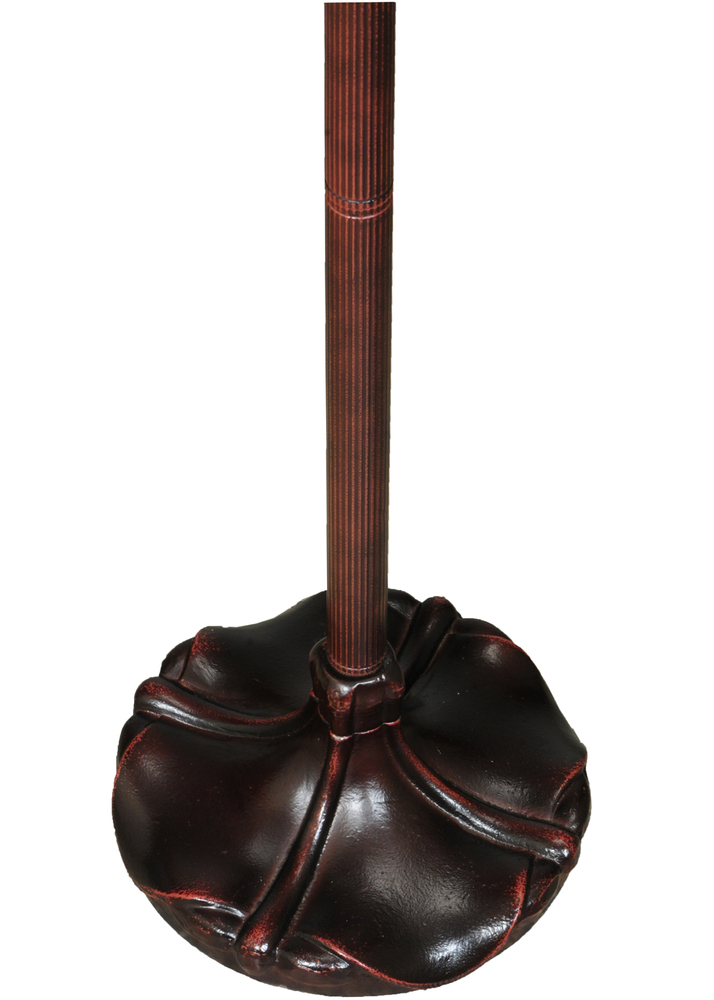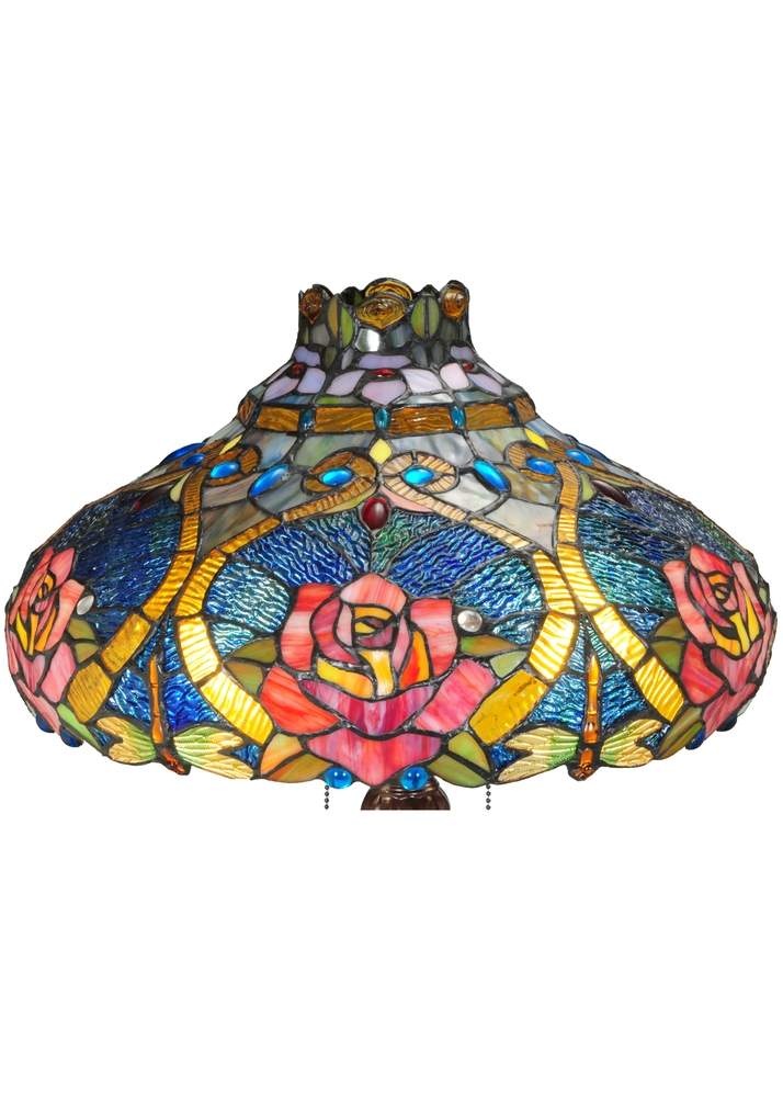 The Dragonfly re-creates Tiffany Studio's most beloved designs in all of its splendor. A Dragonfly flies and dives downward with glowing Golden jeweled eyes and delicate Yellow and Green glass wings that circle over hand-cut and copperfoiled pieces of Golden scrolls with Sky Blue; Clear and Red jeweled dew drops. Red Cabbage Roses are featured on a Blue and Green background which is topped with a crown of Lavender flowers.The art glass shade is created with Meyda Tiffany?s famous copperfoil construction process and complemented with a Mahogany Bronze finished base.