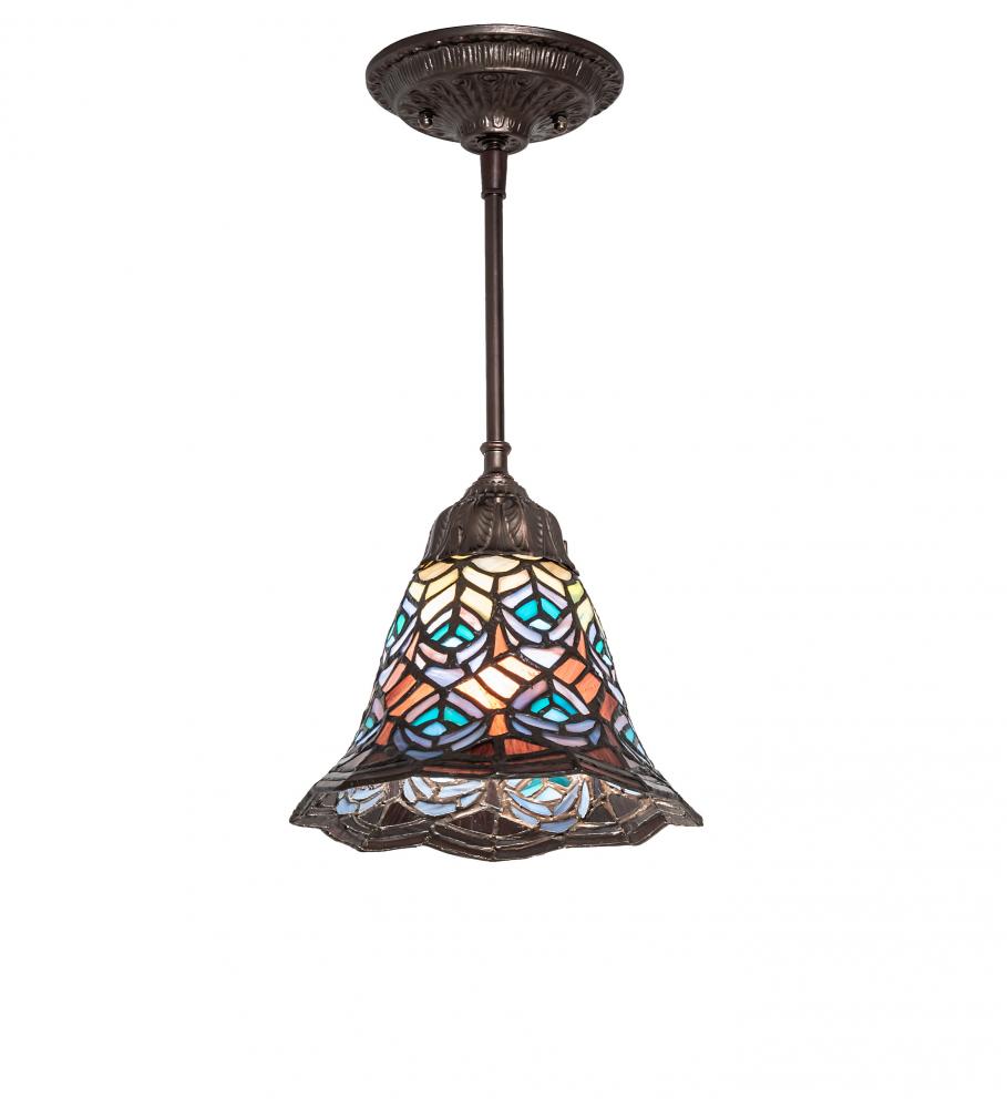 Mauve with Beige; Pink; Orange; and Gray art glass adorn this shade while feathers feature Turquoise Blue and Purple. A scalloped crest of Purple; Blue; Orange & Green edges the shade created using the Meyda Tiffany copperfoil construction. Overall height ranges 15 to 67 inches as suspension rod adjusts & assembles in the field using 4 included tube lengths in Mahogany Bronze finish. The Tiffany Peacock Feather Mini Pendant is featured in our American designed; handcrafted Tiffany Reproduction Stained Glass Lighting Collection. UL & cUL listed for dry and damp locations. Each shade is a unique work of art with color variations based on natural ingredients inherent in the glass. Contact us if color matching is critical when ordering multiple items