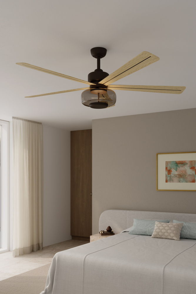 Featuring a Dark Bronze finish with White Oak blades and Brown Smoked shade.
