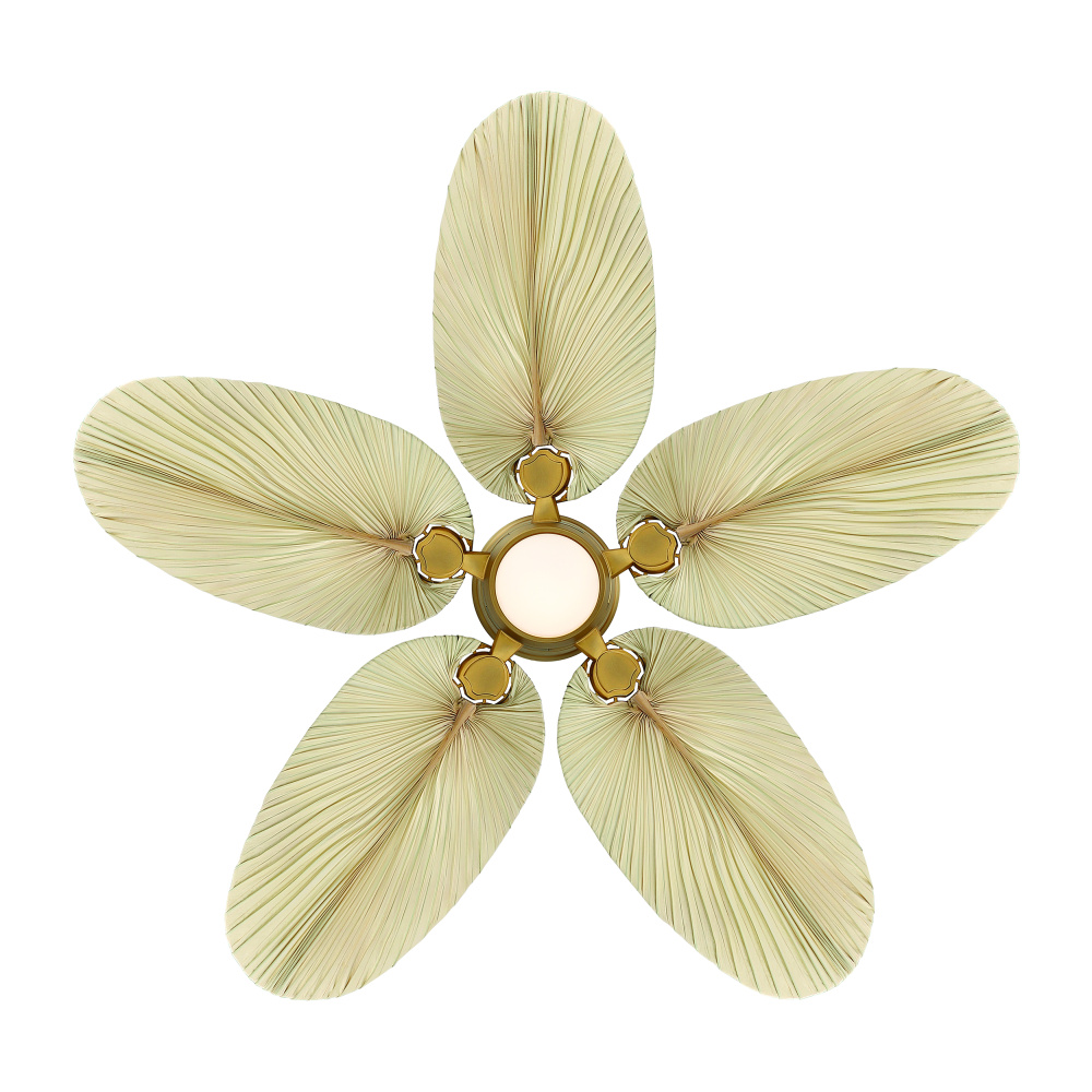 Featuring a Heritage Brass finish with Natural Palm blades and Etched Opal shade.