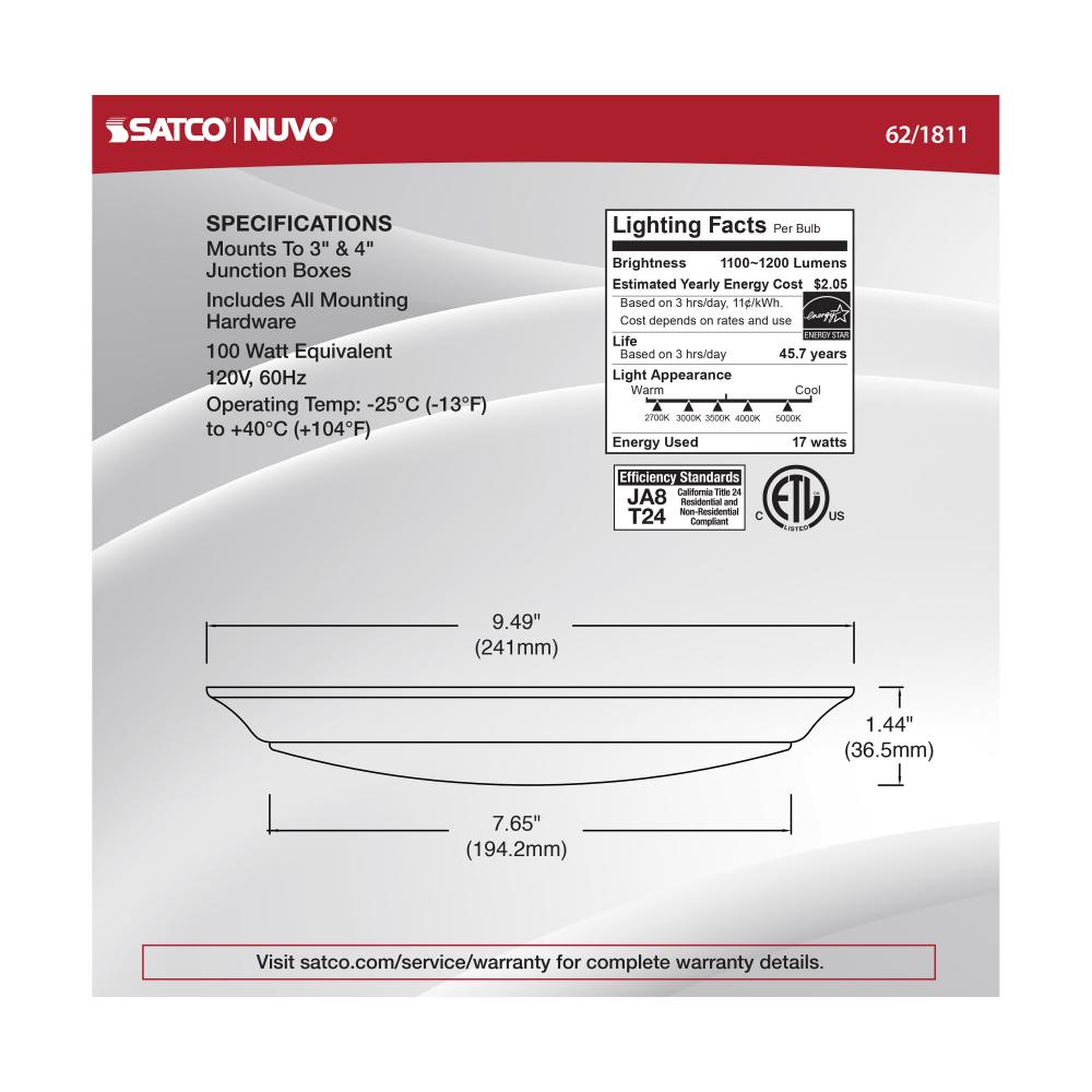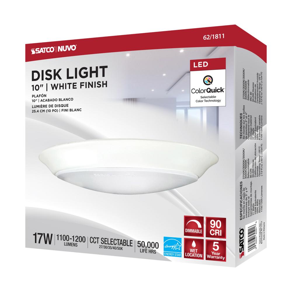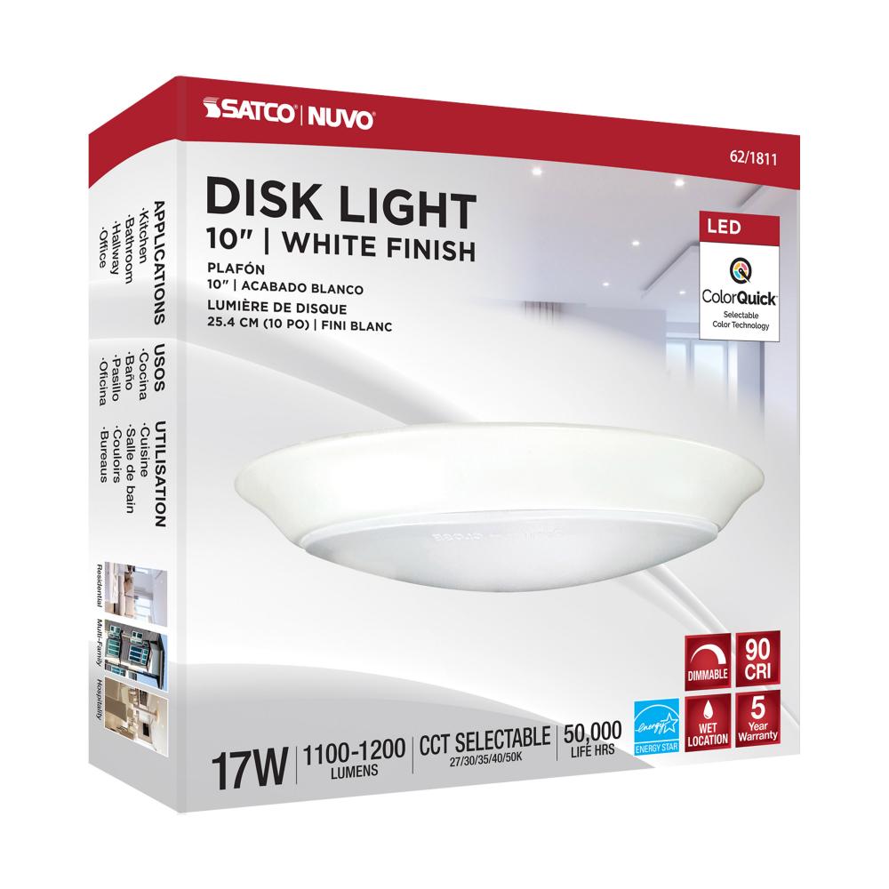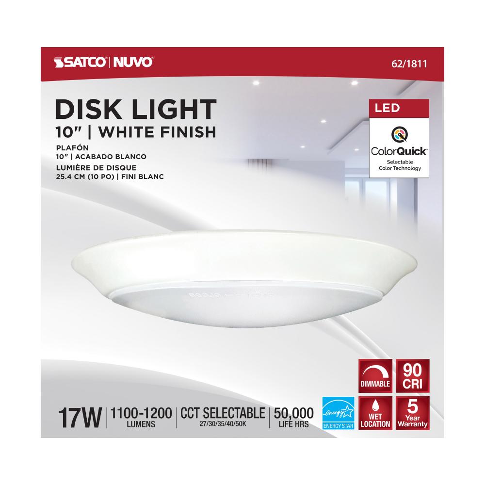 Introducing SATCO NUVO's 62-1811 LED CCT Selectable Disk Light with ColorQuick technology! This 10-inch, 17-watt disk light in white features a high CRI of 93, 2.5kV surge protection, and wet location rating. This CCT Selectable Disk Light is rated for