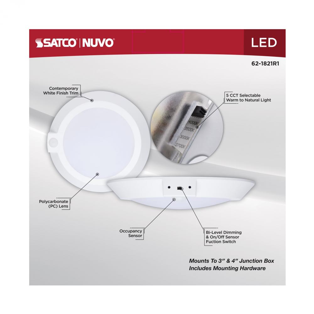 SATCO NUVO's white CCT Selectable Disk Lights deliver efficiency, convenience, and modern performance in 7" and 10" sizes. With five selectable color temperatures (2700K/3000K/3500K/4000K/5000K), these fixtures adapt to a wide range of lighting
