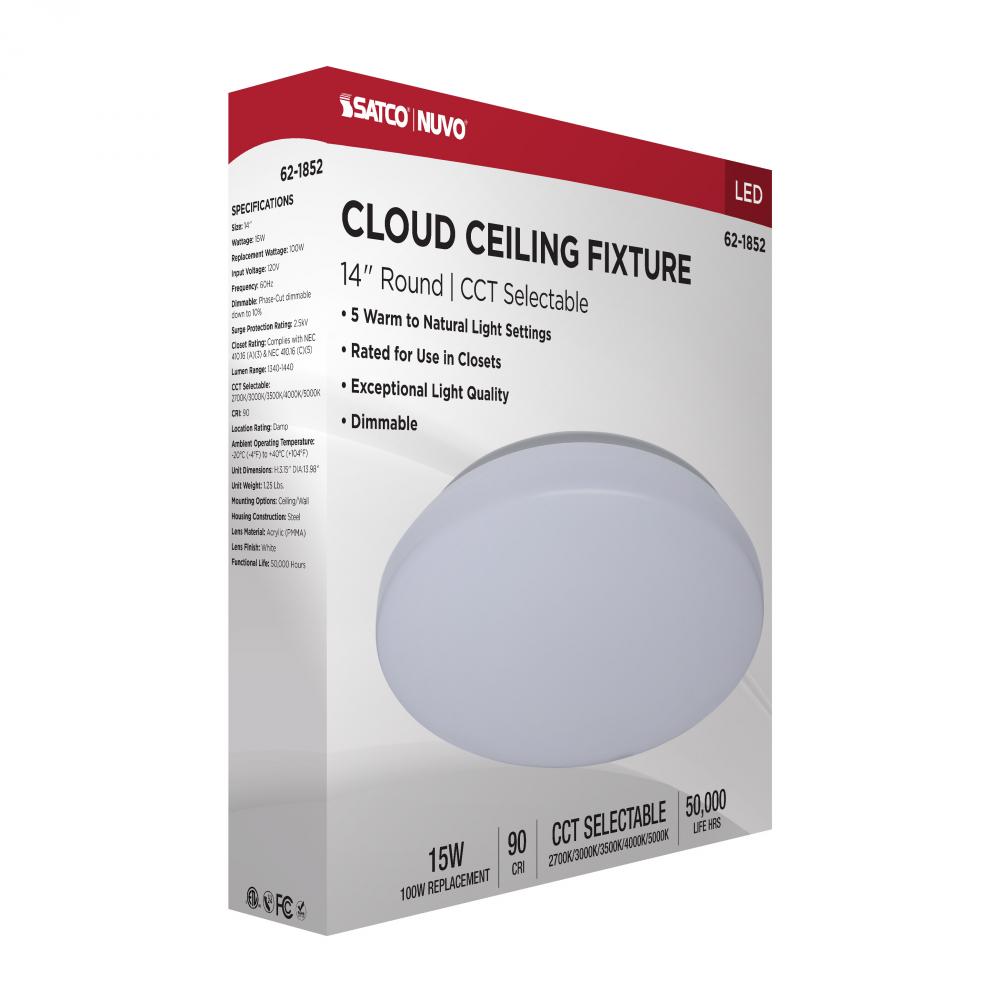 The SATCO NUVO 62-1852, 14-inch round LED Cloud fixture features 5 CCT selectable technology and a high 90 CRI rating, ensuring exceptional and uniform illumination. It is crafted with a durable, non-yellowing PMMA lens and is rated for damp locations, mak