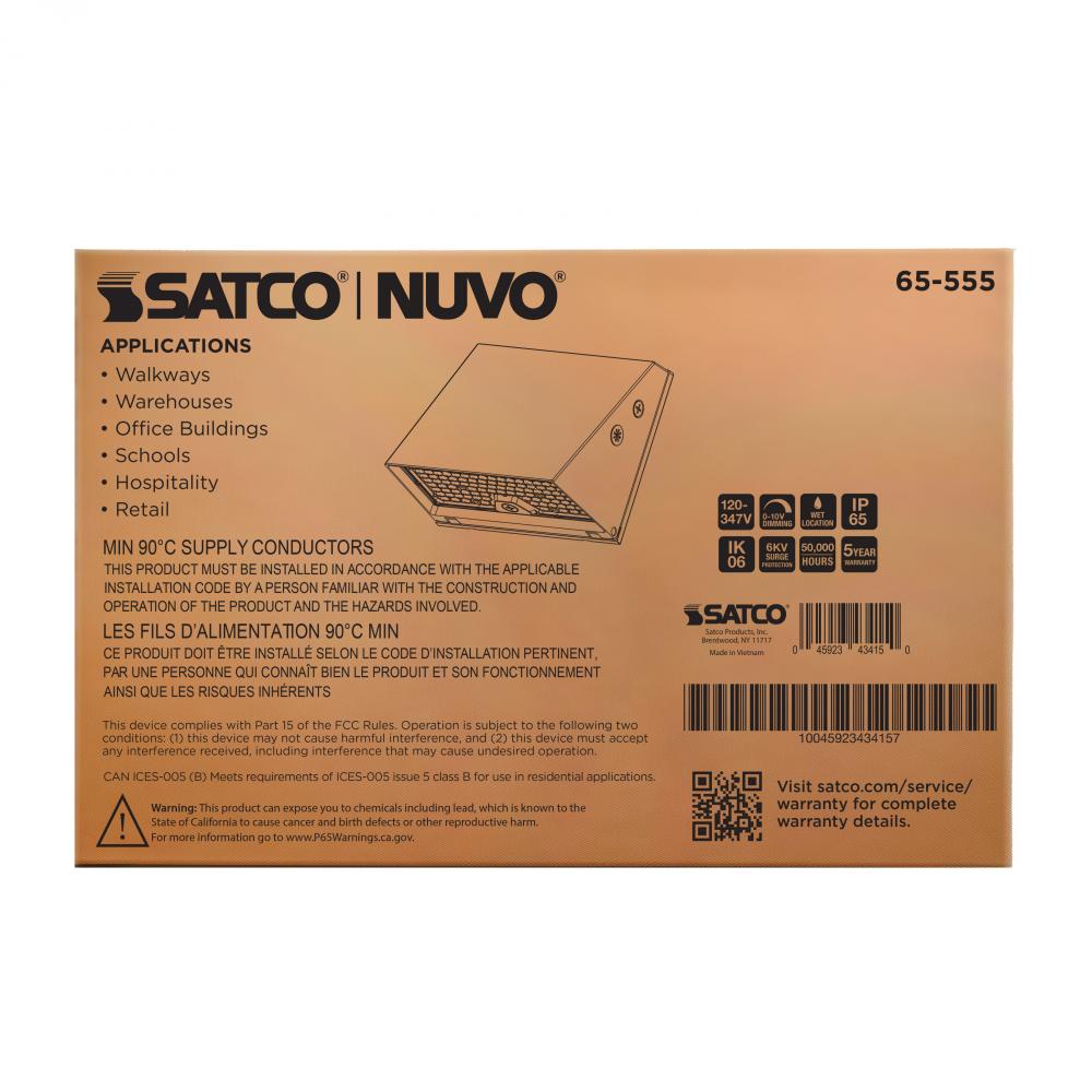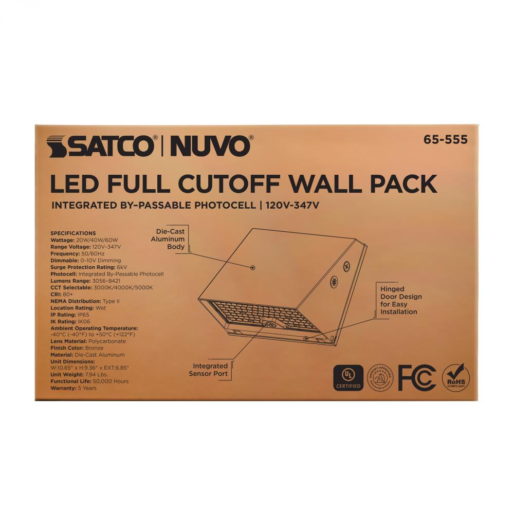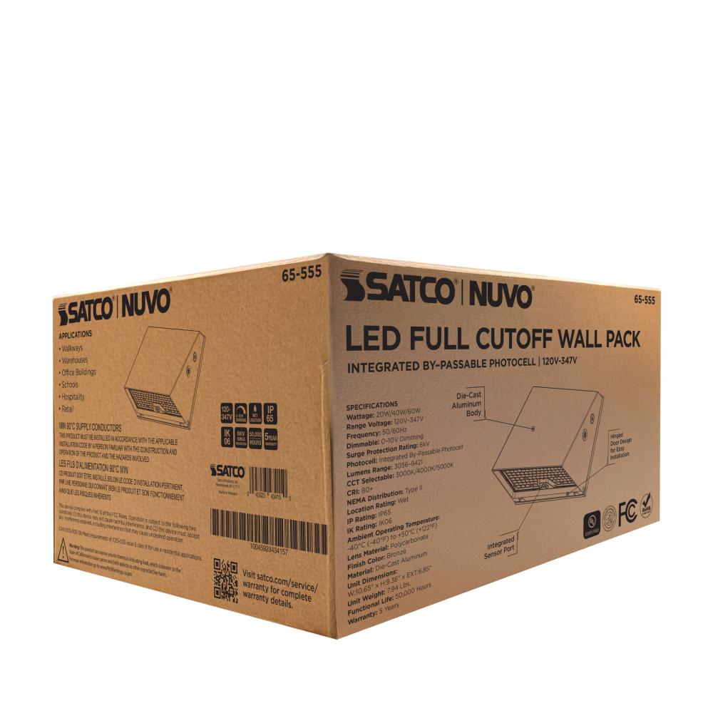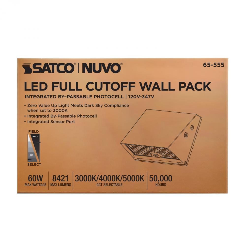 Illuminate outdoor spaces with SATCO NUVO's 65-555 architecturally styled LED Full Cutoff Wall Pack. Operating on 120-347V with zero up light, this fixture features wattage selectability of 20W, 40W, and 60W, delivering a maximum output of 8,421 lumens