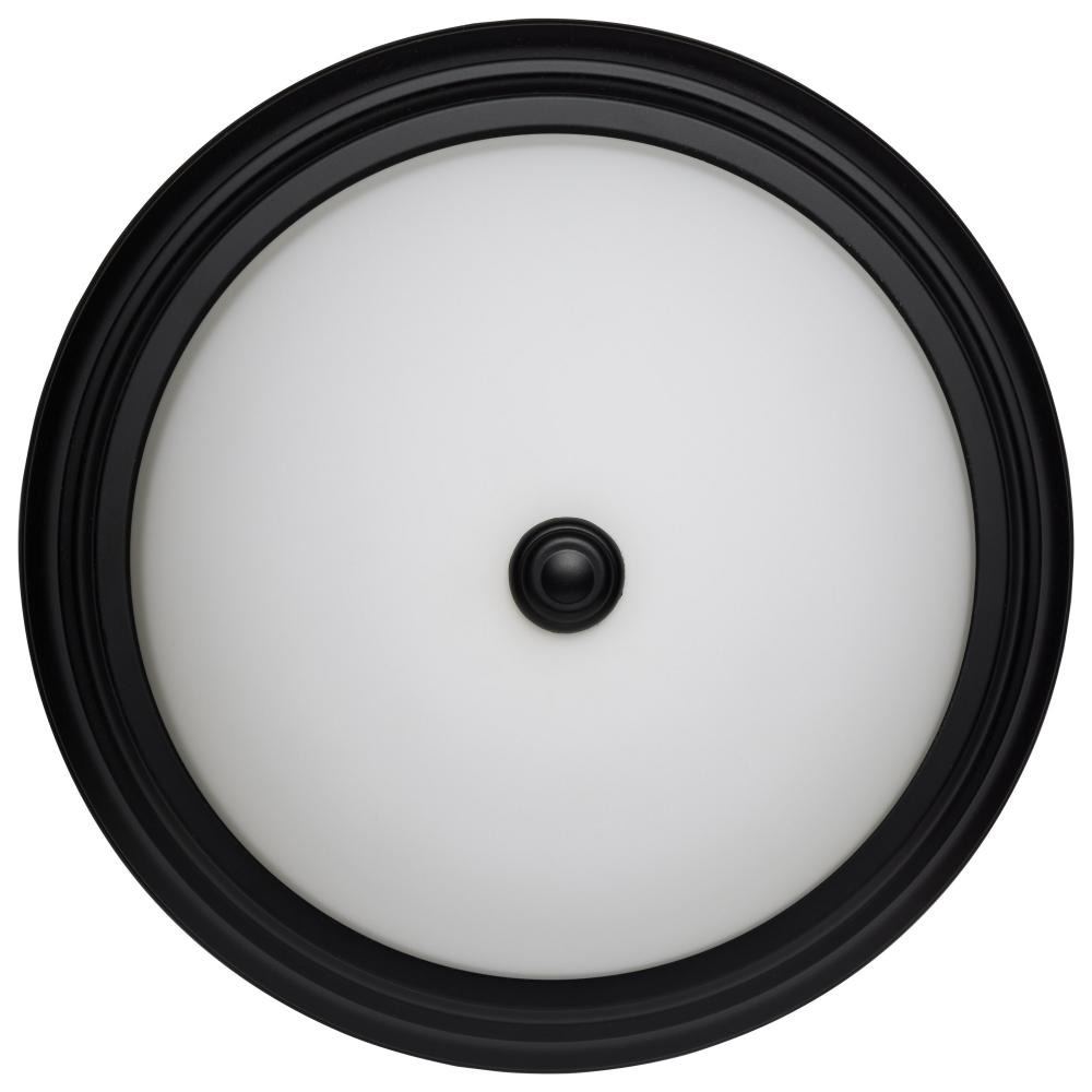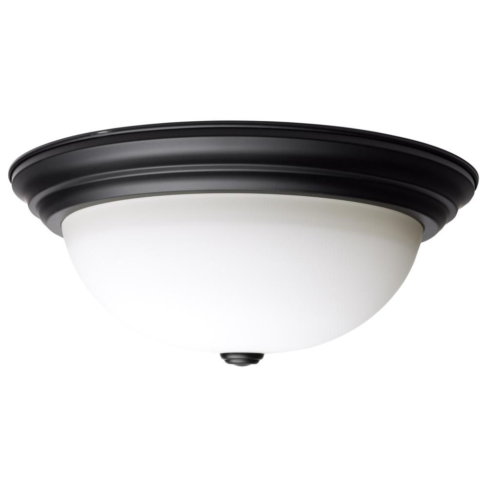 SATCO NUVO's transitional fixtures deliver on high quality and functionality. Stylish in a matte black finish with a glass center lock white opal lens, they are offered in 11, 13, or 15 inch diameters. Accepting standard A19 medium base lamps (not incl