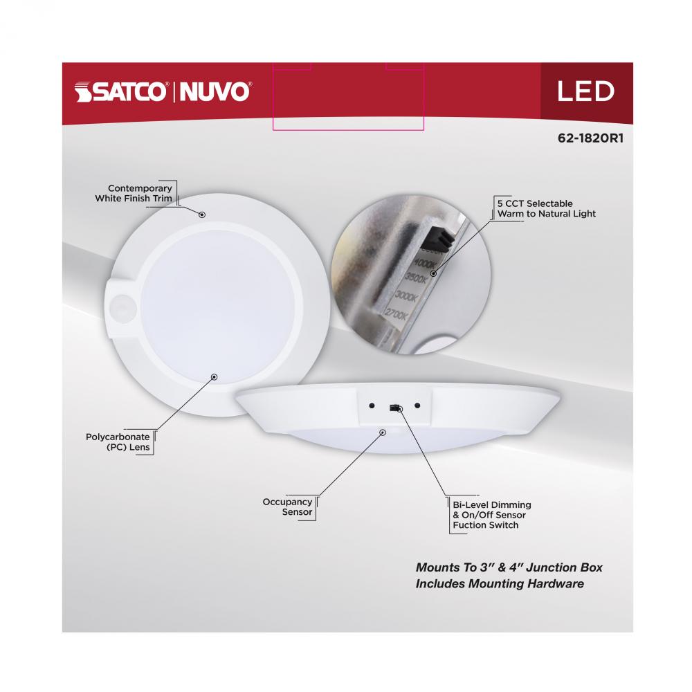 SATCO NUVO's 7-inch white CCT Selectable Disk Light, #62-1820R1, delivers efficiency, convenience, and modern performance in a compact form. With five selectable color temperatures (2700K/3000K/3500K/4000K/5000K), this fixture easily adapts to a wide r