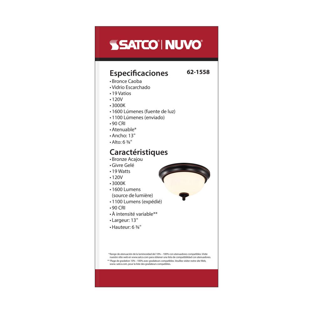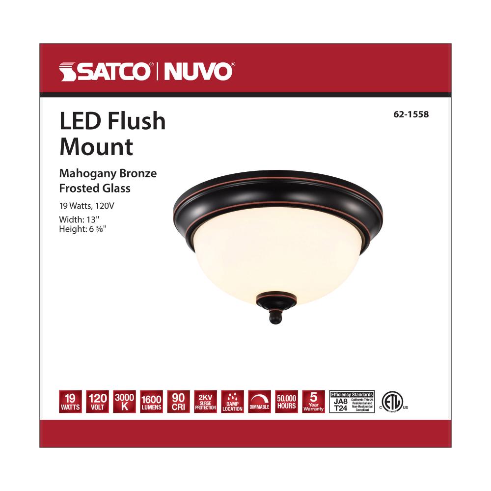 SATCO NUVO'S 62-1558 LED 19 watt, 13-inch flush mount offers the perfect blend of integrated LED technology and utility-style lighting. This simple flush mount illuminates a dark stairwell, hallway or laundry room to name a few applications. The froste