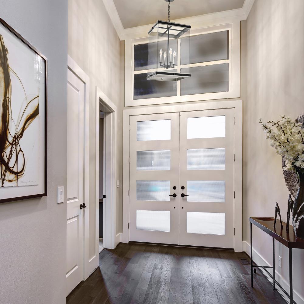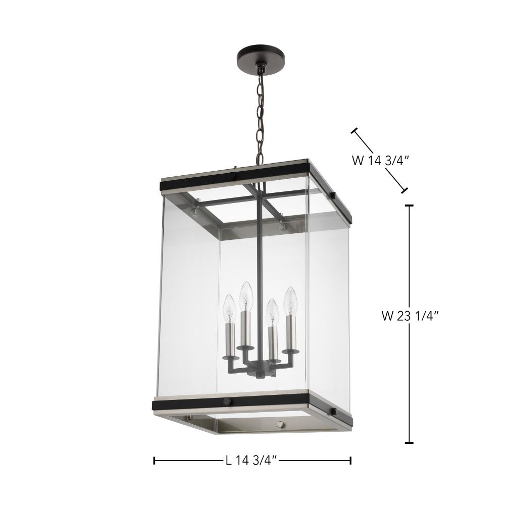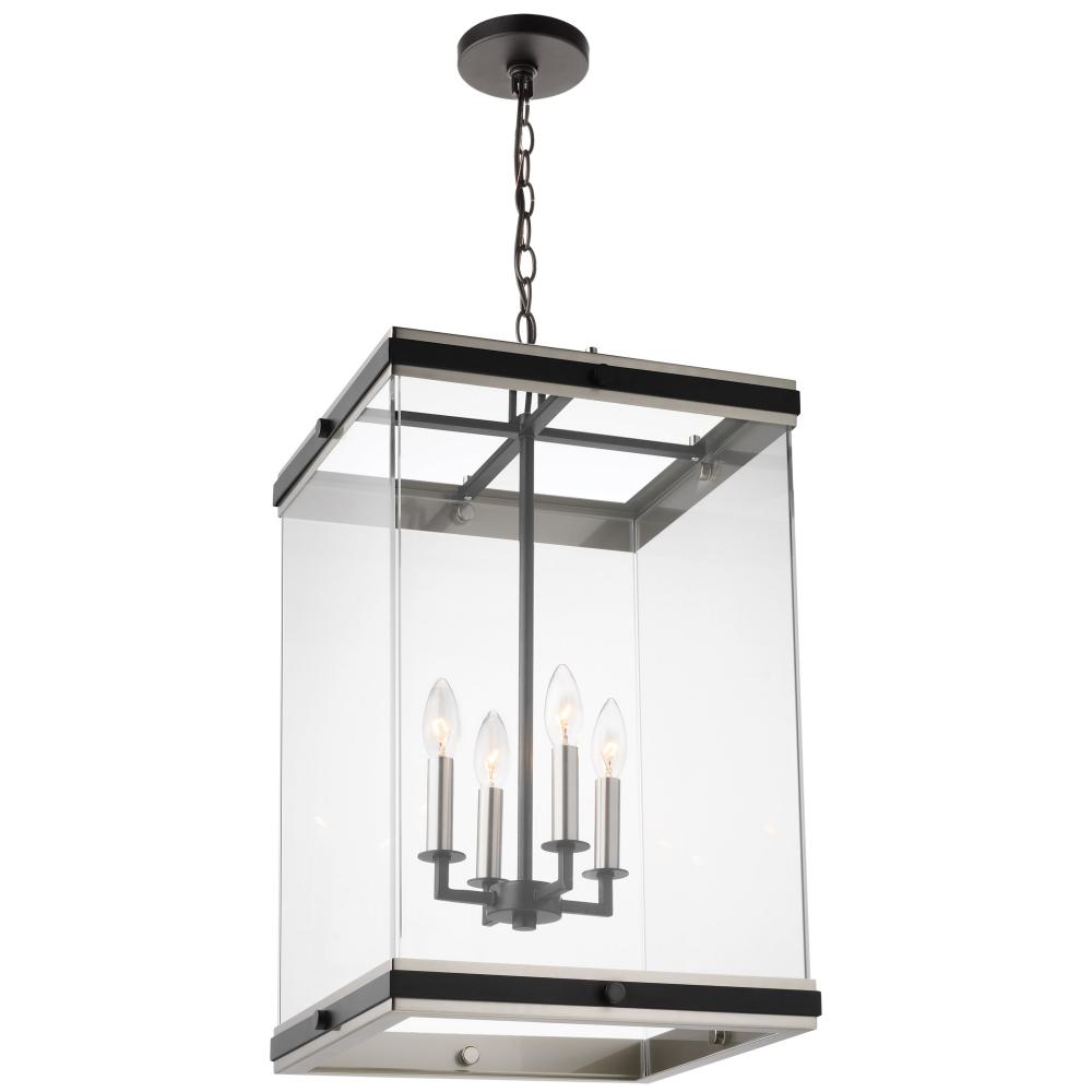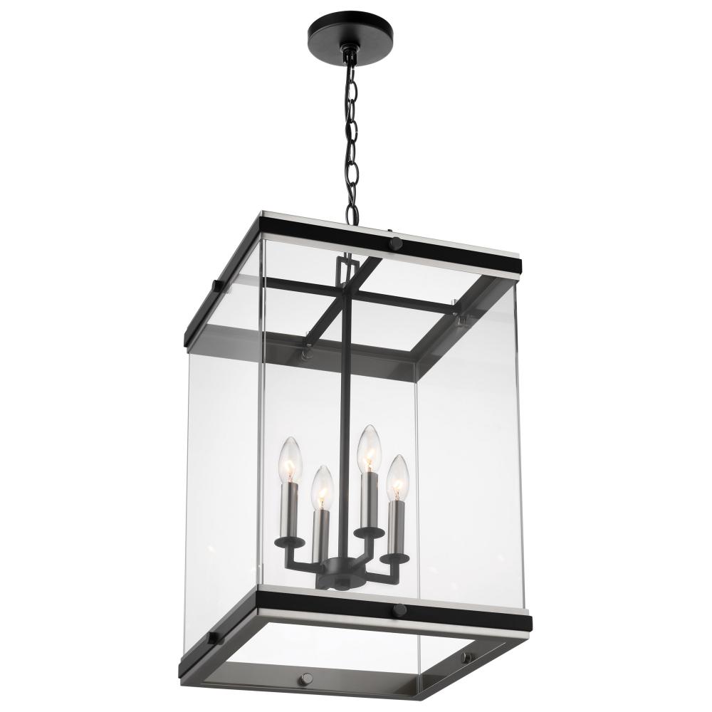 A combination of glass and metal comes together to create the stunning design of the Crossroad foyer pendant. The square, clear glass panels showcase the bulbs. The sockets and base are finished in brushed nickel to contrast beautifully with the matte blac
