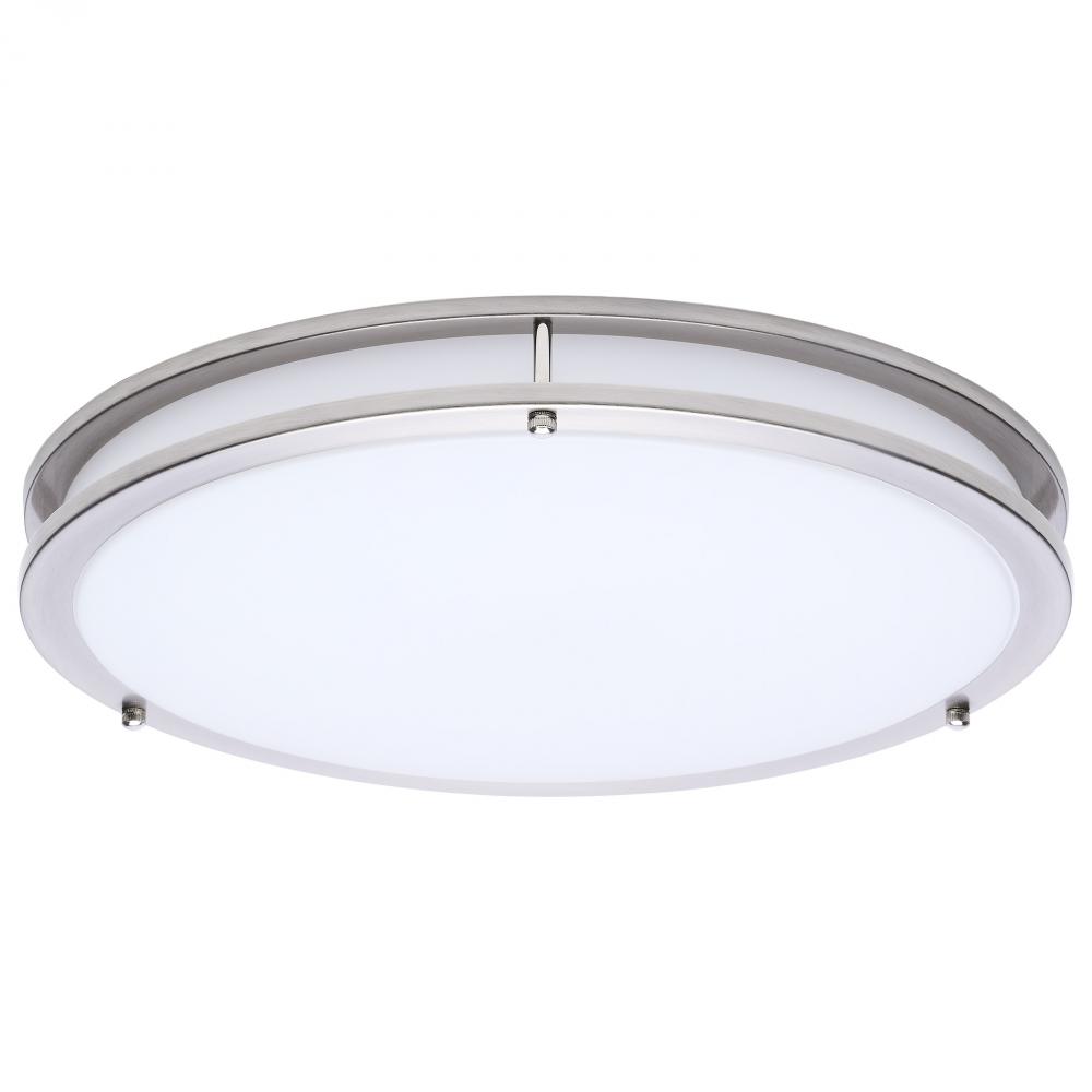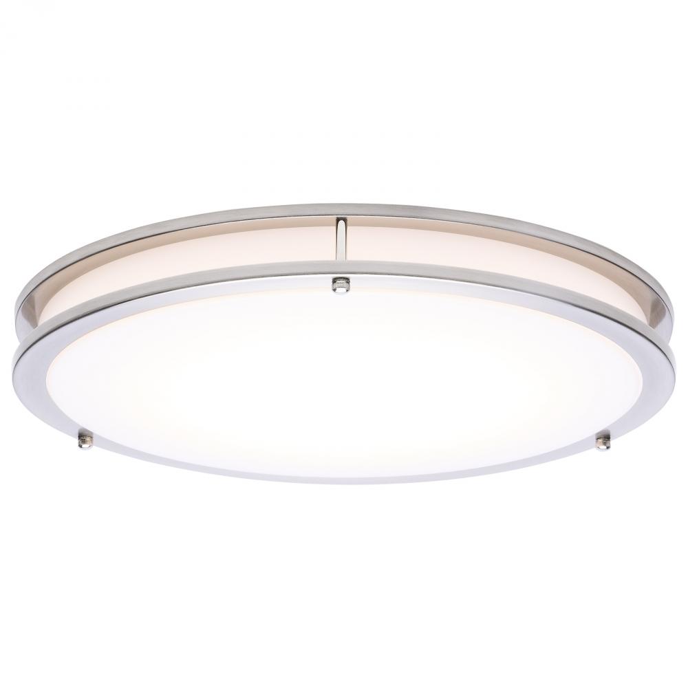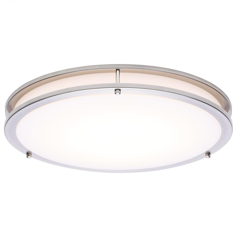 The SATCO NUVO 62-1877 Glamour 17-inch Round Flush Mount in Brushed Nickel delivers sleek, modern lighting with 5 CCT selectable technology (2700K–5000K) and 90 CRI illumination for enhanced color rendering. This 25-watt fixture replaces 200W incandescen