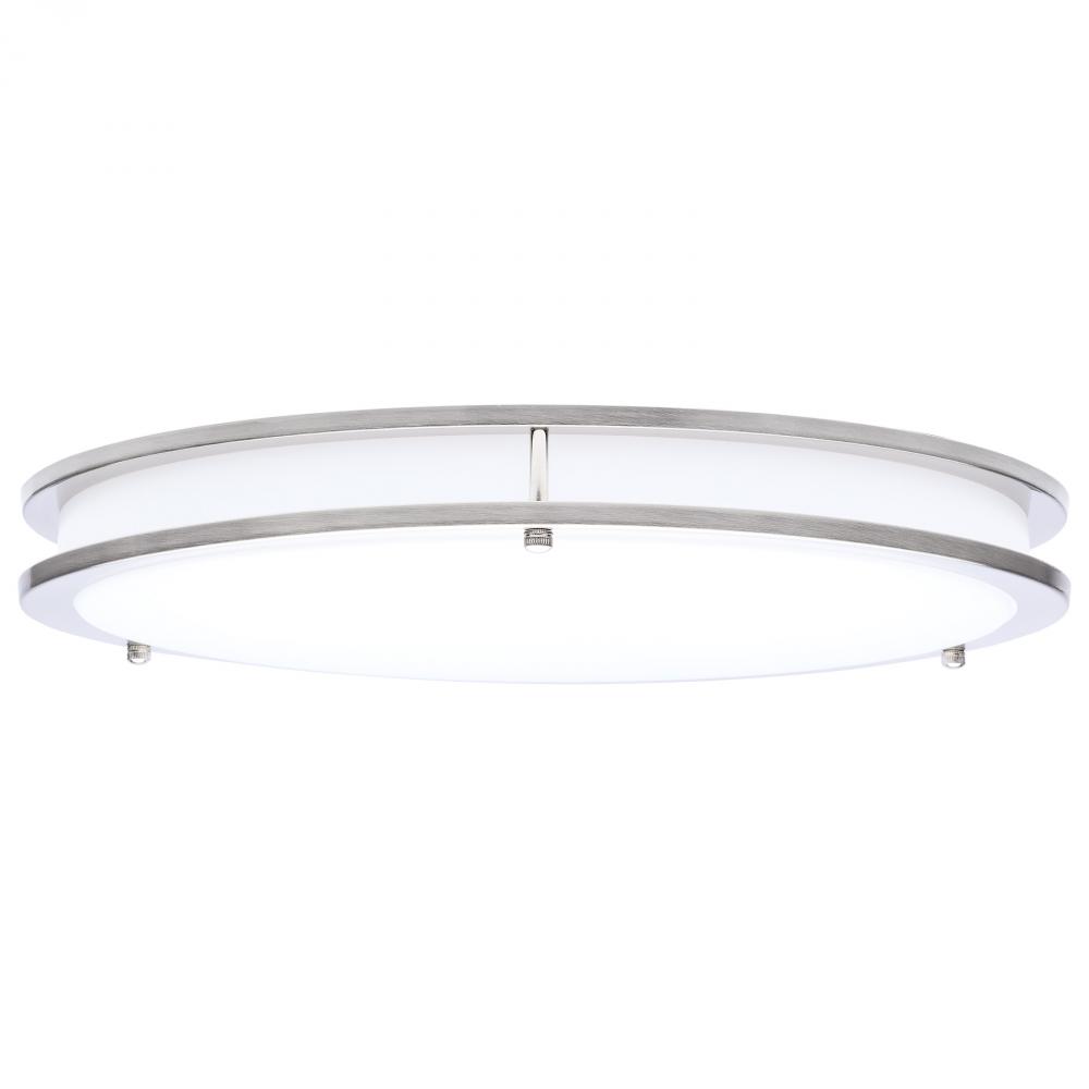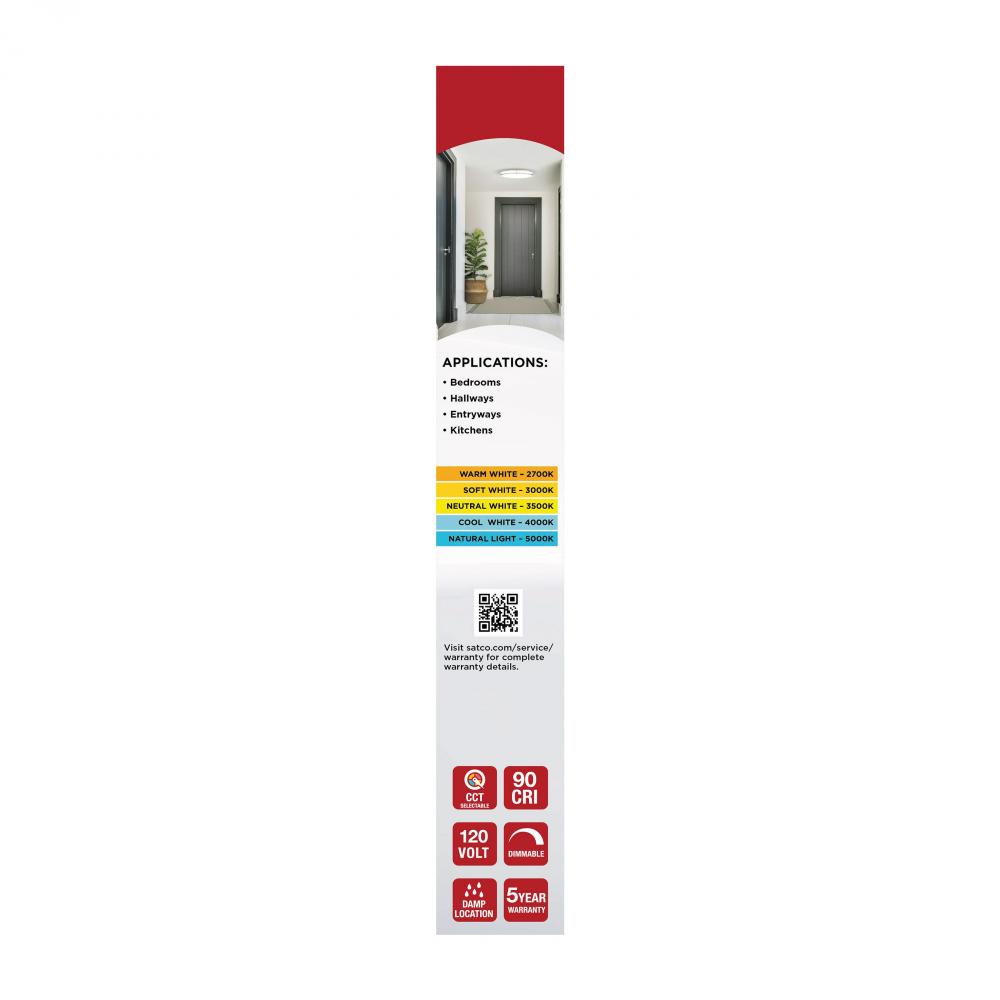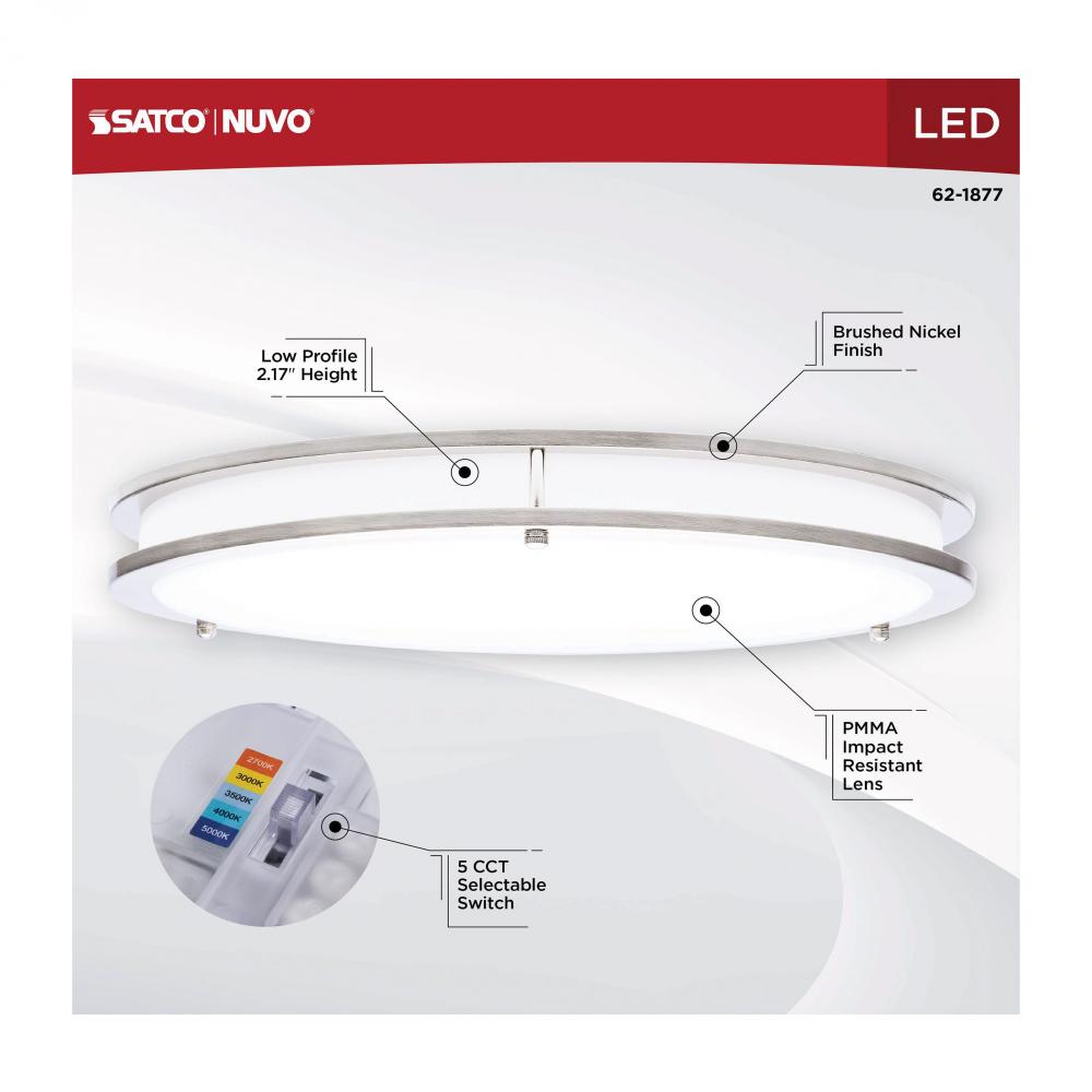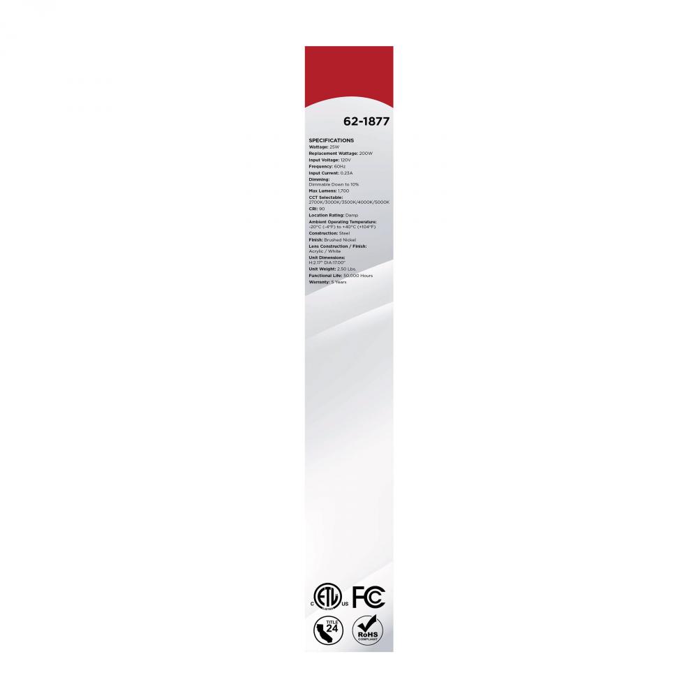 The SATCO NUVO 62-1877 Glamour 17-inch Round Flush Mount in Brushed Nickel delivers sleek, modern lighting with 5 CCT selectable technology (2700K–5000K) and 90 CRI illumination for enhanced color rendering. This 25-watt fixture replaces 200W incandescen