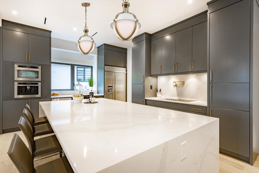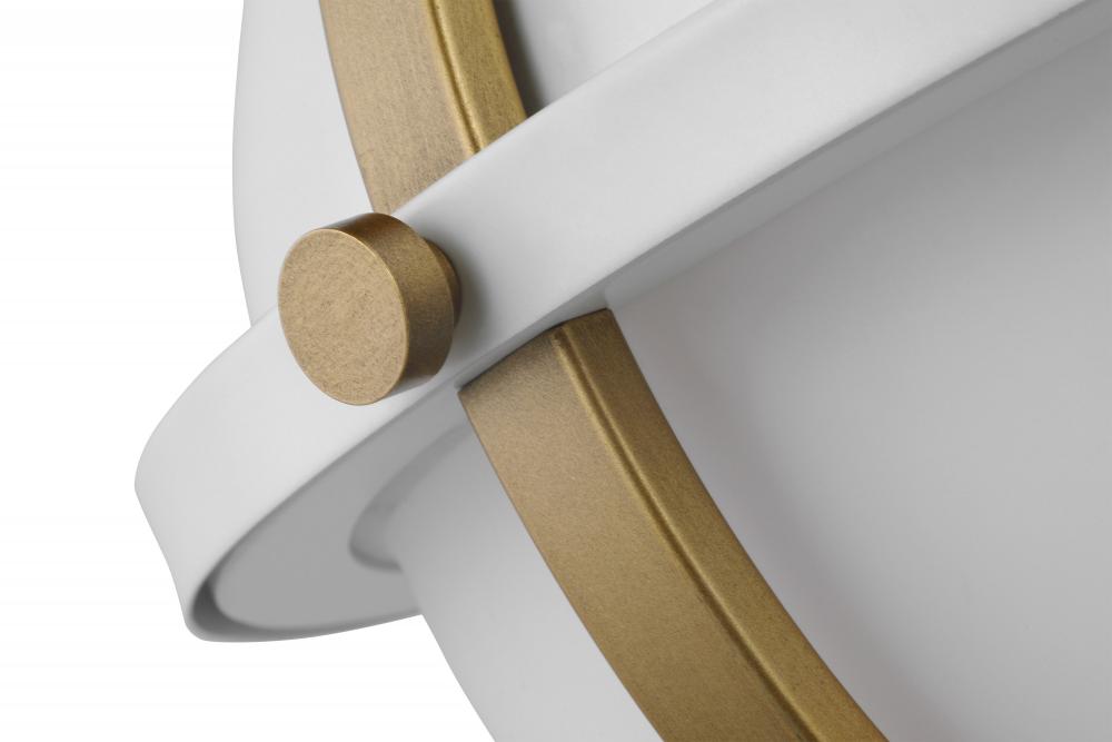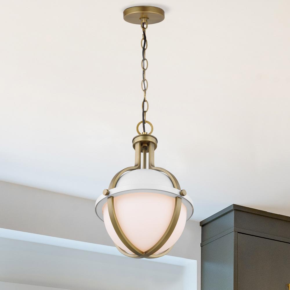 The striking Lincoln 60-7664 medium pendant was inspired by an armillary sphere, consisting of a framework of elegant rings. Broad, circular bands surround the orb, and knob details in a brass hue enhance the opal glass and matte white finish for a promine