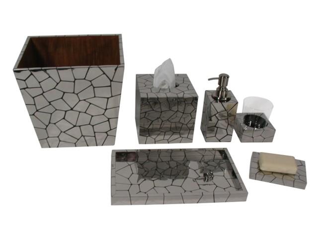 Pieces of Babyshell and stainless steel are inlaid and defined with black grout. Made in Philippines.