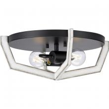 Clean, modern lines combine with rustic elements in the Galloway Collection Flush Mount Light. A lightly distressed finish of grey washed oak highlights an open, angular frame suspended from an impressive circular canopy finished in brushed nickel. Brushed nickel columns hold lights that glow brightly within the stately form to illuminate spaces in a casually elegant style. The close-to-ceiling design provides clear, bright illumination to bedrooms, hallways and foyers. Use vintage-style decorative bulbs (sold separately) to enhance the rustic effect.