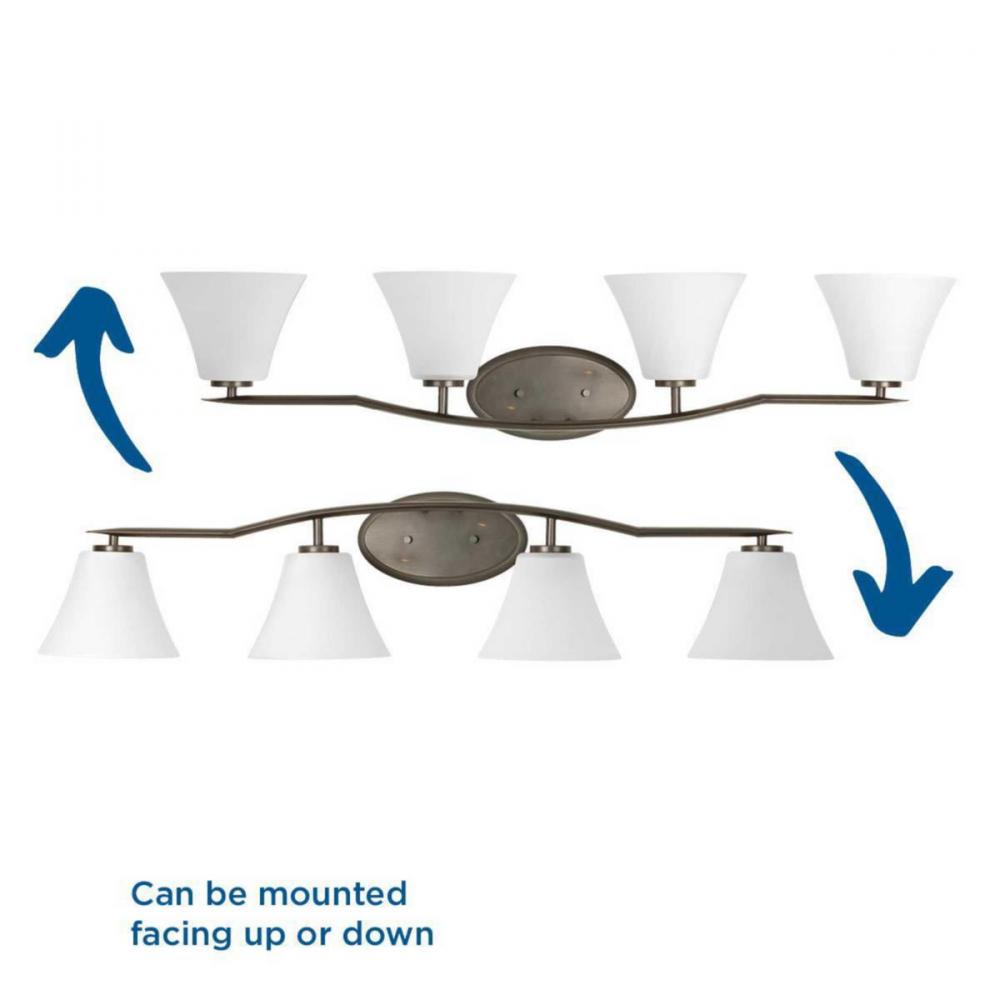 Ideal for a bathroom;Perfect for modern and transitional style settings;Handsome antique bronze finish;Elegant etched glass shades;Mount the light fixture facing up or down;Use 4 medium base bulbs that are sold separately (100 W max - LED/CFL/incandescent)