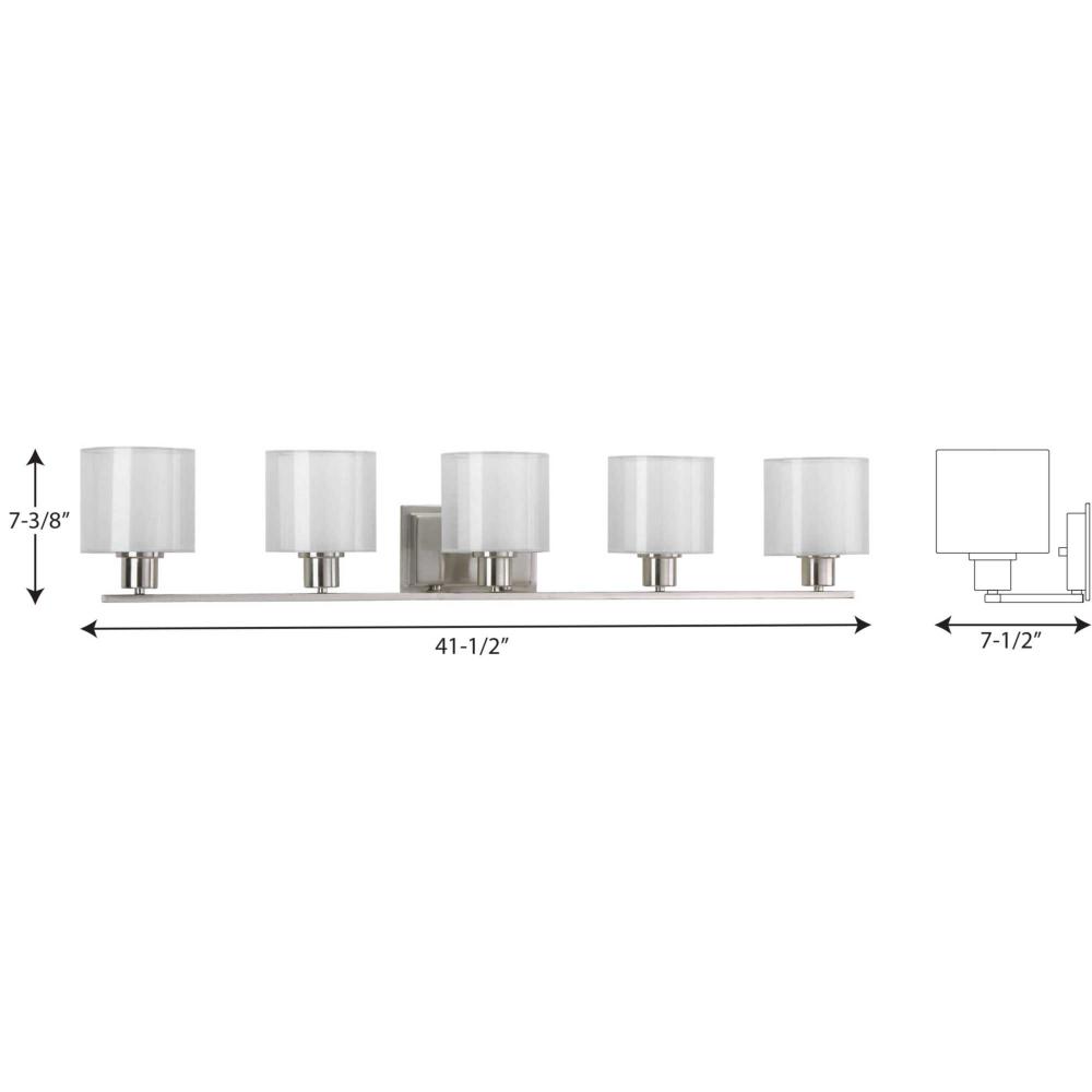 Invite the beauty of light into your home with this Brushed Nickel five-light bath fixture. Invite provides a welcoming silhouette with a unique shade comprised of an inner glass globe encircled by a translucent sheer Mylar shade. The rich, layering effect creates a dreamy look that is both elegant and modern. Offered as a complete collection, the Invite styling can be carried throughout your home or as a focal style in a special room.