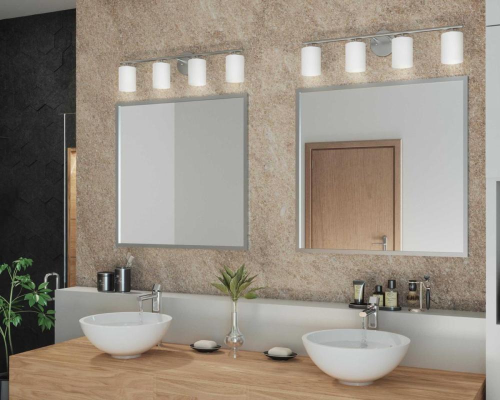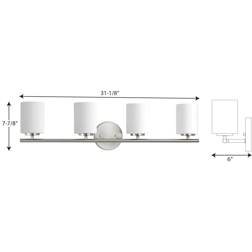 Ideal for a bathroom;Perfect for modern and transitional style settings;Beautiful brushed nickel finish;Elegant etched painted white glass shades;Mount the light fixture facing up or down;Use 4 medium base bulbs that are sold separately (100 W max - LED/CF