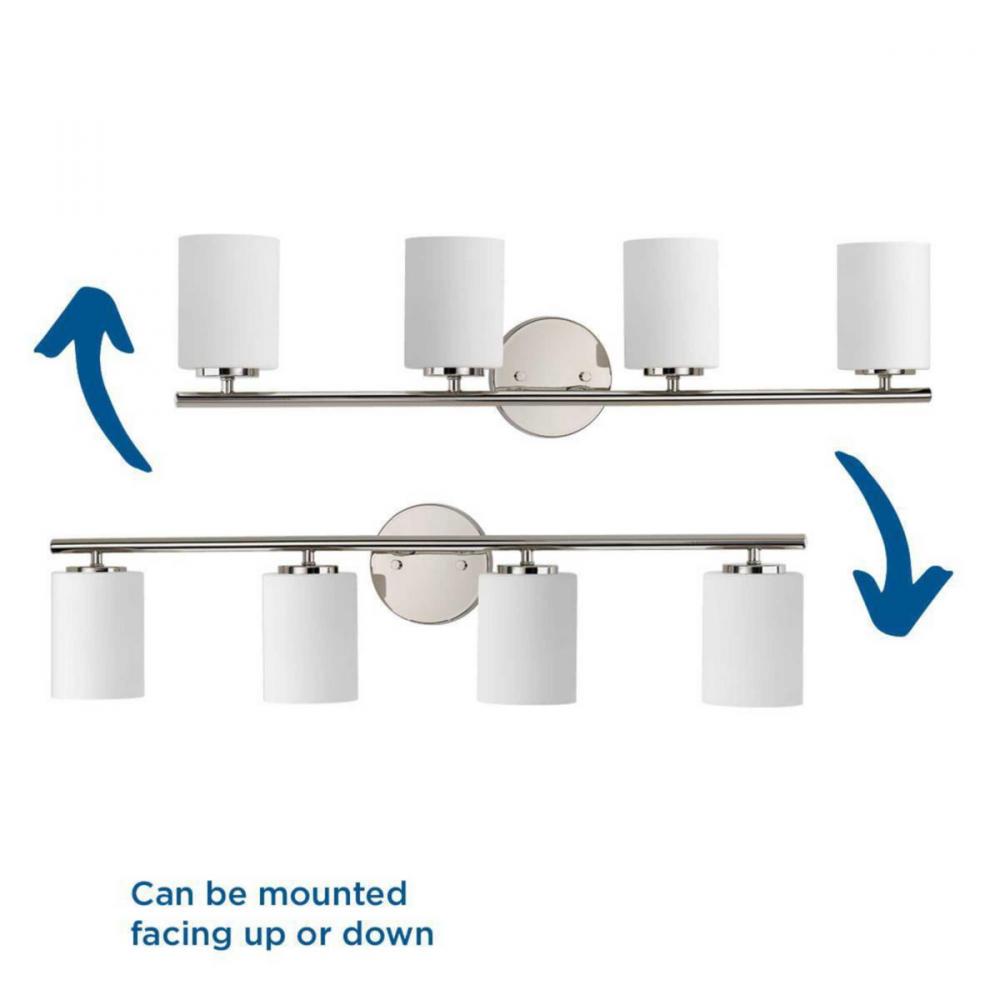 Ideal for a bathroom;Perfect for modern and transitional style settings;Subtle polished nickel finish;Elegant etched painted white glass shades;Mount the light fixture facing up or down;Use 4 medium base bulbs that are sold separately (100 W max - LED/CFL/