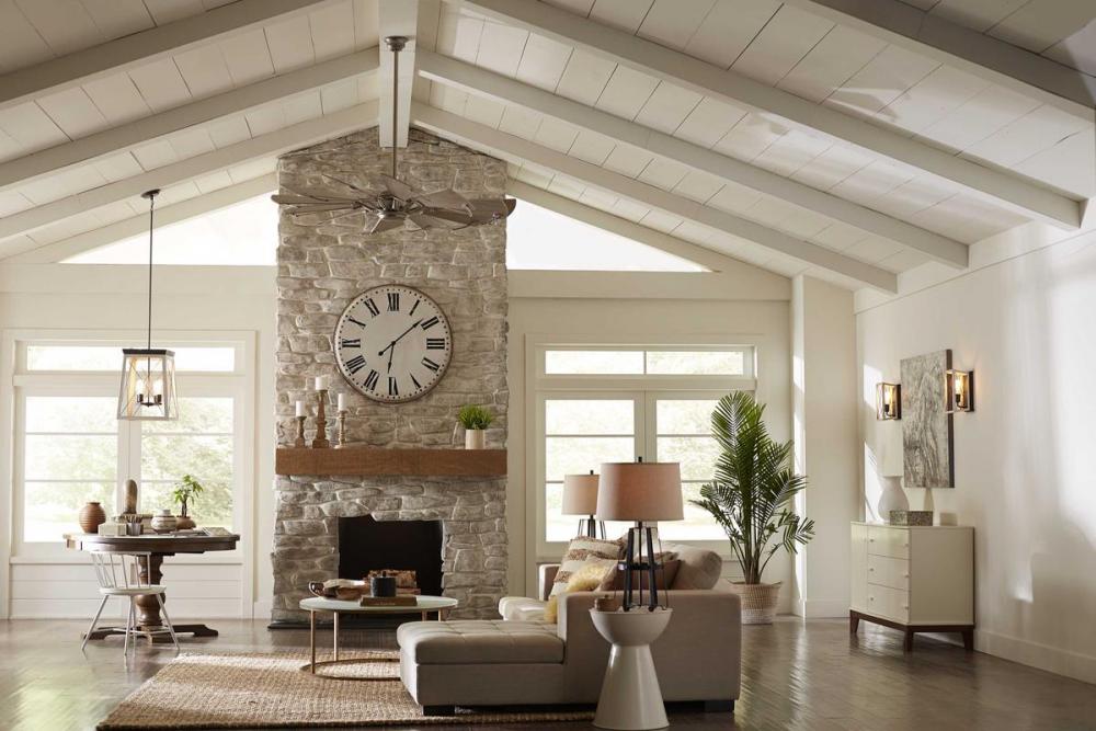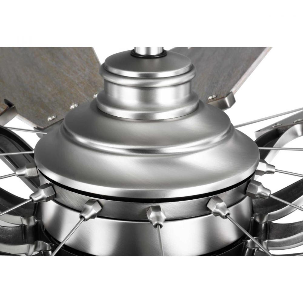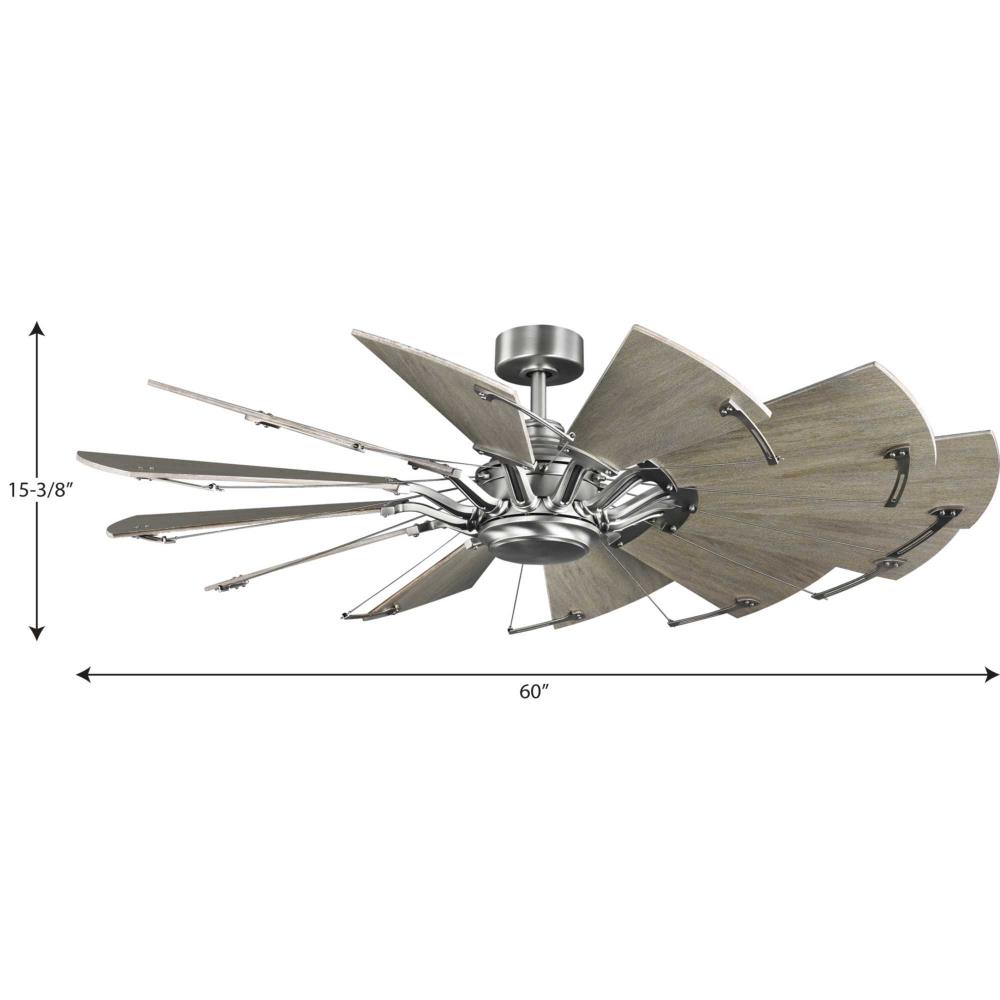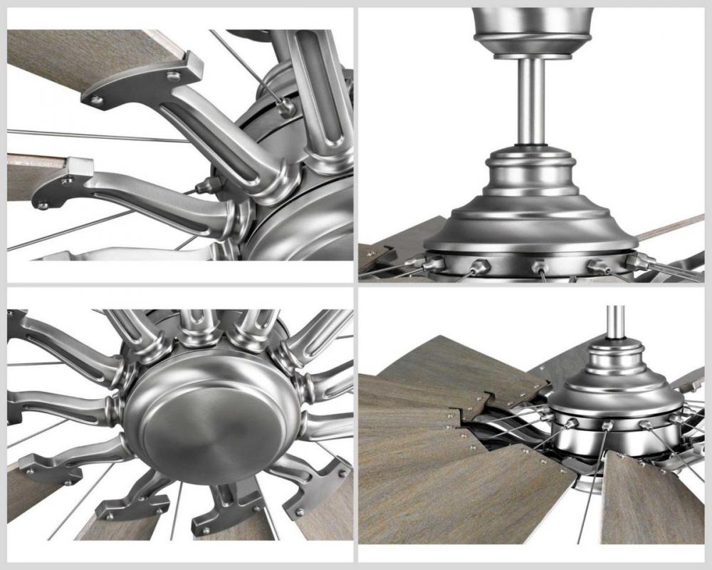 12-blade, 60” statement-making ceiling fan was inspired by the form and function of a windmill;Powerful and quiet DC Motor;Features White Barnwood finished blades;Springer ceiling fan with Antique Nickel finish and White Barnwood blades;Beautiful and exp