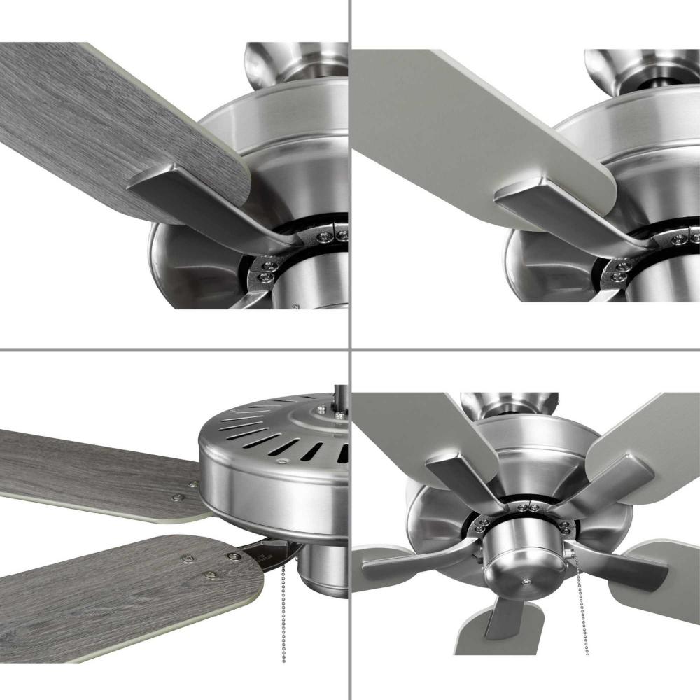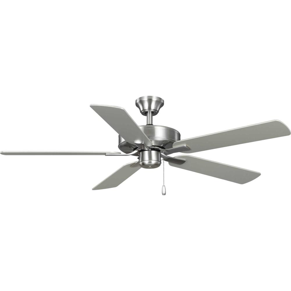 The AirPro 52” 5-blade ceiling fan refreshes interiors with a sleek, modern form coated in smooth Brushed Nickel finish. Five clean-lined fan blades extend outward from a streamlined motor housing that contains a powerful AC motor. Its versatile yet timeless design makes it ideal for a wide range of interior décor styles. The fan has an AC motor and is rated for maximum efficiency. The fan accepts a universal light kit and an accessory wall and remote control (all sold separately). The fan can be installed on a flat or sloped ceiling. The blade arms have Captive Screws allowing for easier installation.