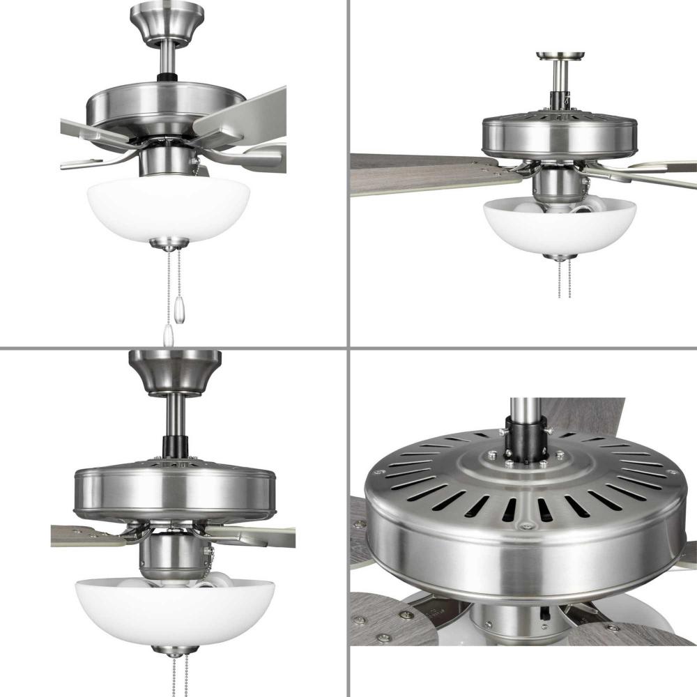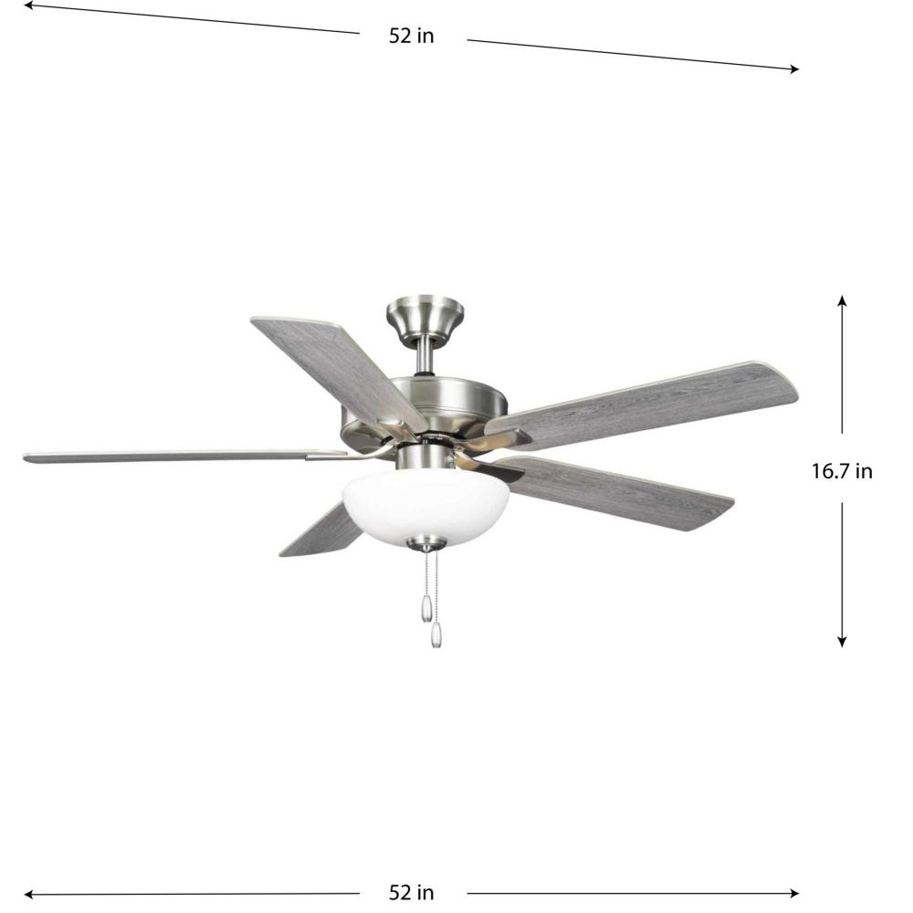 The AirPro 52” 5-blade ceiling fan refreshes interiors with a sleek, modern form coated in smooth Brushed Nickel finish. Five clean-lined fan blades extend outward from a streamlined motor housing that contains a powerful AC motor. Its versatile yet timeless design makes it ideal for a wide range of interior décor styles. The fan has an AC motor and is rated for maximum efficiency. A Unipack option packages the light kit so that it ships with the fan, eliminating both the need to order the light kit separately and having the light kit shipped separately from the fan. A shatterproof white Frosted polypropylene dome shade offers durability and optimal, even illumination. Two medium based LED lamps (8.5-Watt, 80CRI, 3000K) are included. An accessory wall and remote control can be added (sold separately). The fan can be installed on a flat or sloped ceiling. The blade arms have Captive Screws allowing for easier installation.
