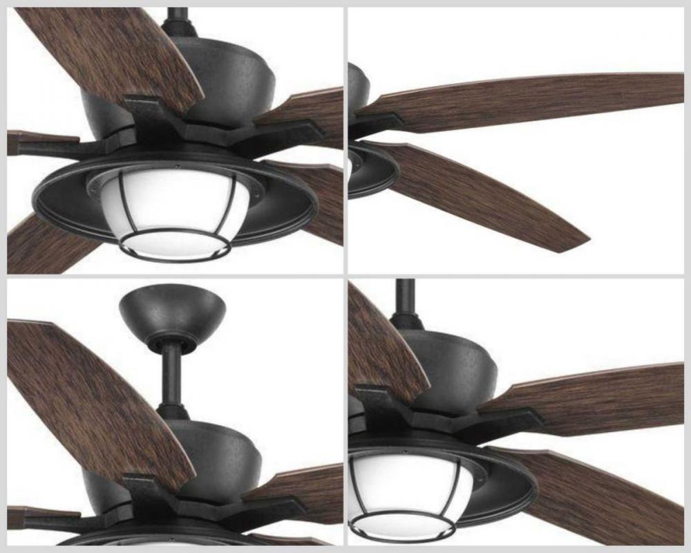 This five-blade 60 inch Forged Black with toasted oak blades Montague ceiling fan features an all weather wet location rating (ABS) to accommodate a variety of interior and exterior locations. The white opal glass shade contains a 17W dimmable, 3000K LED module, offering both form and function with energy- and cost-savings benefits. A remote with batteries is included. The Montague features a dual mount system to offer greater flexibility when installing.