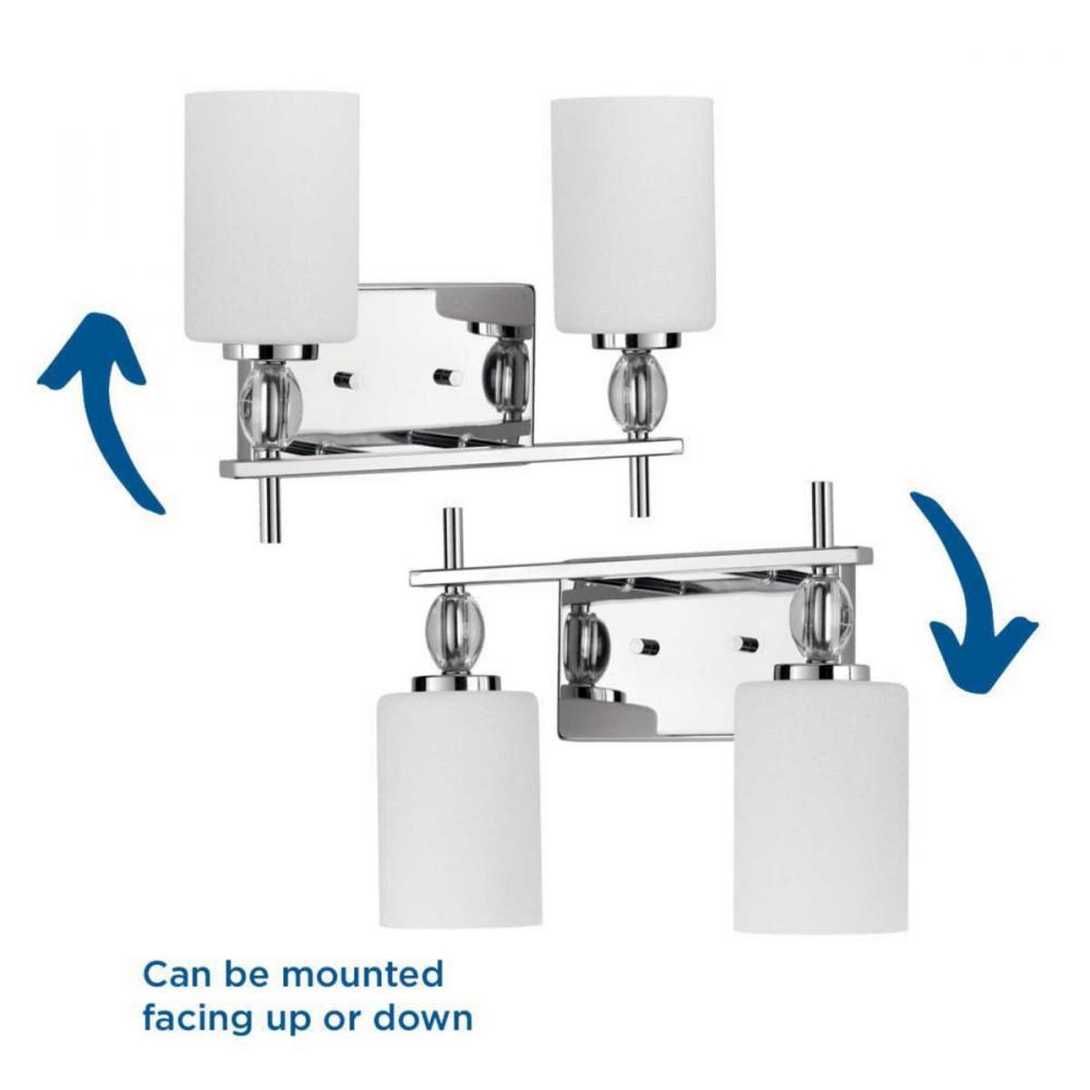 Enjoy high status with a two-light bath & vanity full of fun, femininity, glimmer and gleam. K-9 glass accents offer crystal-like clarity to contrast the softened linen-finish glass shades. A Polished Chrome frame provides the perfect support to this elegant combination.