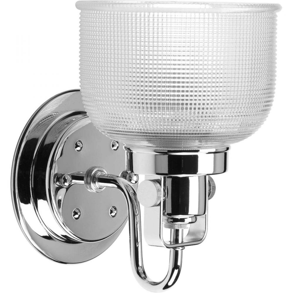 Ideal for a bathroom, hallway, or foyer;Perfect for coastal, farmhouse, transitional, and vintage electric style settings;Crisp polished chrome finish;Stunning clear double prismatic glass shade;Mount the light fixture facing up or down;Use 1 medium base b