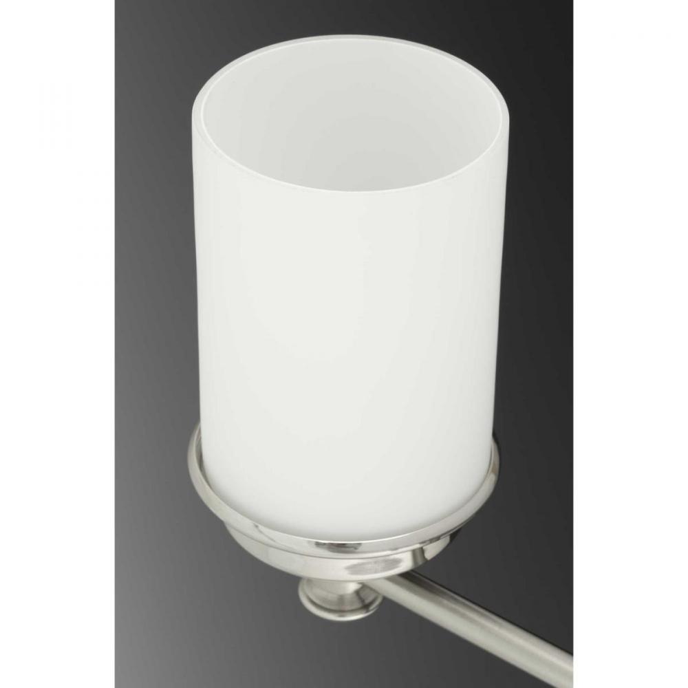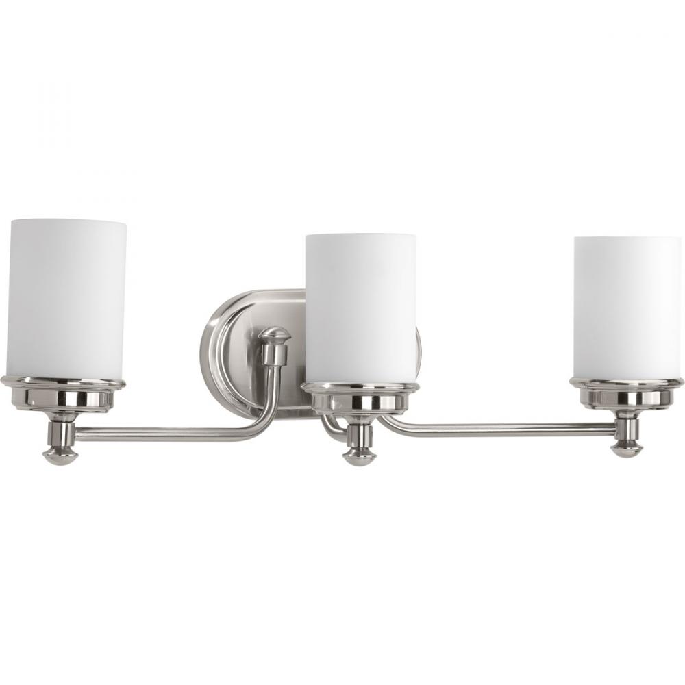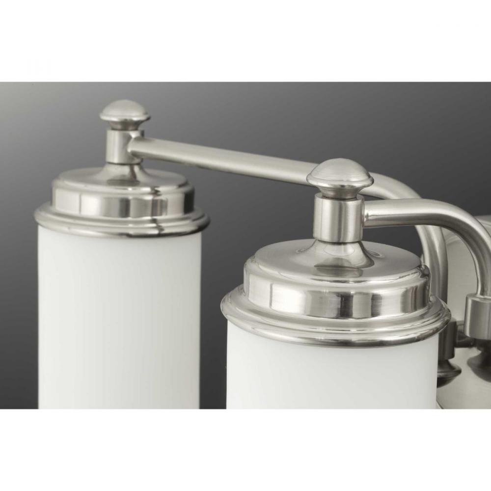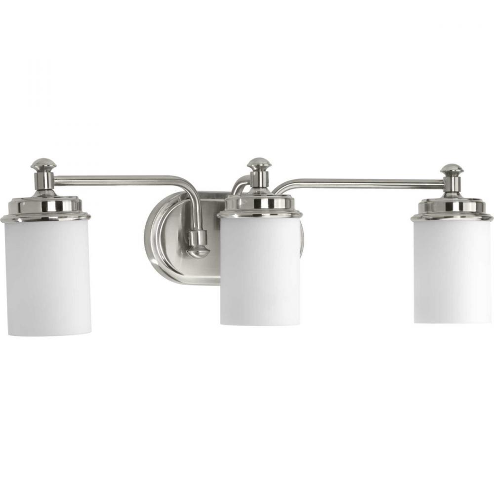 Ideal for a bathroom;Perfect for coastal, farmhouse, and transitional style settings;Beautiful brushed nickel finish;Elegant etched opal glass shades;Mount the light fixture facing up or down;Use 3 medium base bulbs that are sold separately (100 W max - LE