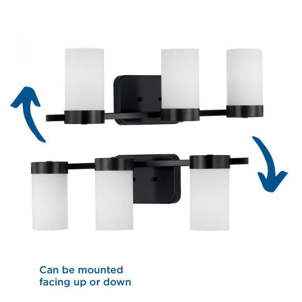 Achieve a Modern look with the Elevate Collection three-light bath and vanity. Etched glass white shades provide a striking contrast to the Matte Black finish. Fixtures can be installed with glass facing up or down for added customization.