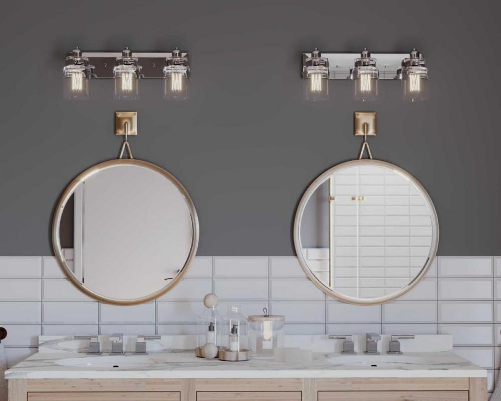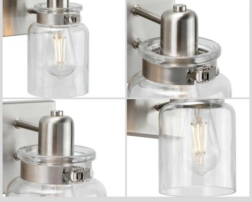 Ideal for a bathroom;Perfect for farmhouse and urban industrial style settings;Beautiful brushed nickel finish;Crisp clear glass shades;Mount the light fixture facing up or down;Use 3 medium base bulbs that are sold separately (100 W max - LED/CFL/incandes