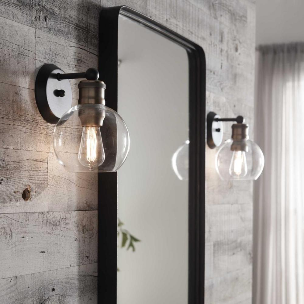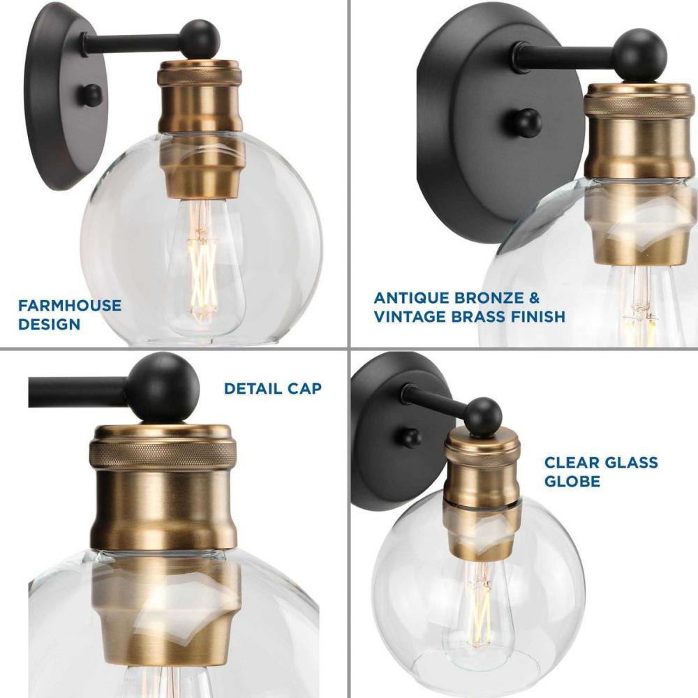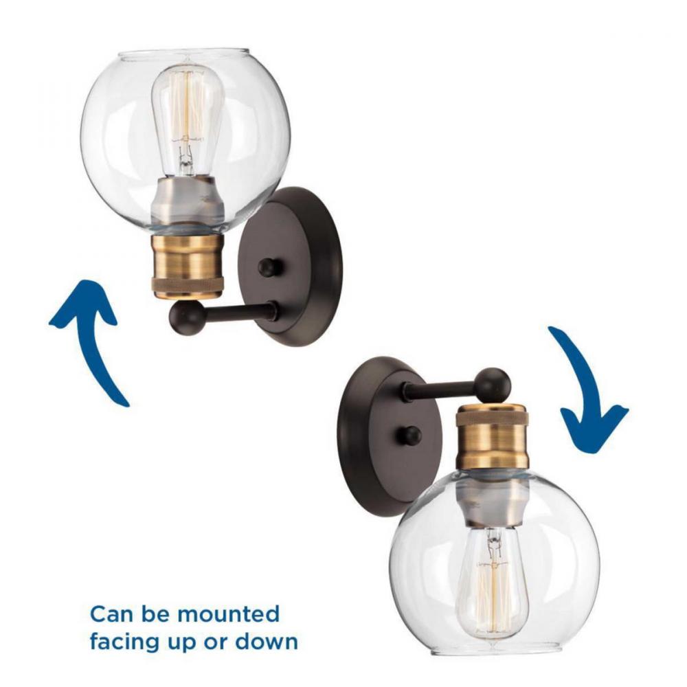 Ideal for a bathroom, dining room, hallway, or foyer;Perfect for coastal, farmhouse, and vintage electric style settings;Handsome antique bronze finish with vintage brass accents;Crisp clear glass shade;Mount the light fixture facing up or down;Use 1 mediu