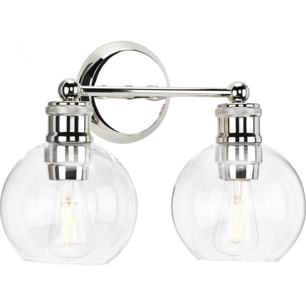 The Hansford collection of fixtures feature a clear, spherical shade paired with vintage style metal fittings in a Polished Nickel finish. Featuring a clean and precise design with generous scale, Hansford's classic style brings tranquility to your home with. Hansford lends itself to Farmhouse, Coastal or Industrial interiors. Can be used with clear or vintage bulbs for a variety of looks. The two-light bath & vanity fixture can be mounted up or down.