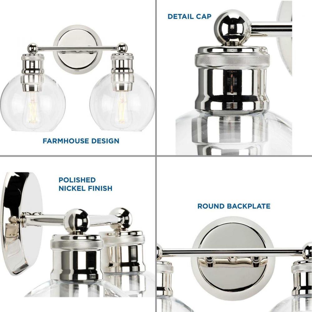 Ideal for a bathroom and powder room.;Perfect for coastal, farmhouse, and vintage electric style settings;Subtle polished nickel finish;Crisp clear glass shades;Mount the light fixture facing up or down;Use 2 medium base bulbs that are sold separately (100